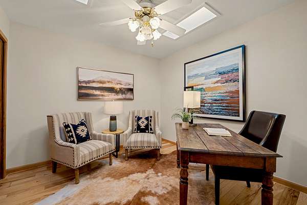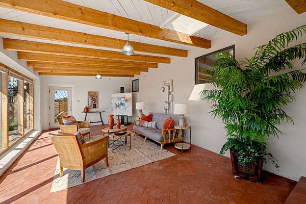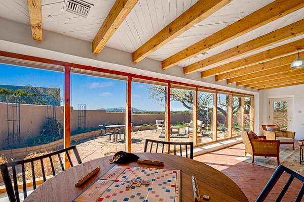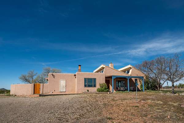 Set on 5 acres and just 20 minutes to downtown Santa Fe, this exceptional property offers breathtaking 360-degree mountain views and an ideal blend of comfort, versatility, and New Mexico charm. The 3-bedroom, 2-bath home includes a dedicated office, large sunroom flanked by a walled courtyard and is extensively renovated, showcasing quality, craftsmanship and thoughtful upgrades.The beautifully updated kitchen features custom maple wood cabinetry, copper sink, large center island with seating, granite countertops, and premium appliances: a six burner 42" Wolf gas stove with grill and double oven along with Sub-Zero.The spacious primary suite offers a luxurious bath complete with dual steam/shower for two, jetted tub with granite surround, travertine tile walls, vanity with granite-top and updated fixtures plus a custom solid hardwood closet system. Additional improvements include hickory wood flooring throughout, Pella triple-pane windows, solid alder wood interior doors, and an upgraded laundry room with maple cabinetry, granite counter and slate tile flooring. This home has underground electric and natural gas, a newer septic, private well with 3-acre feet of water registered with the NM State Engineer, newer bitumen roof and two-zoned forced heat/refrigerated air for year-round comfort & instant tankless water heater. Beyond the main residence, the property features a two-story studio, 1,000 sq.ft. total perfect for creative pursuits or a home business. Additionally, a 2,500 square foot outbuilding for a tradesman or large workshop with ample parking.For the horseman, rancher or privacy seeker, there is a contiguous, transferable, fenced 40-acre land lease from the NM Land Commissioner at a $50 yearly rent. Horses can run free to graze. Permission for future stables or other structures on the leasehold can be had with the investment cost returnable.This property offers a rare opportunity to enjoy peaceful rural living with easy access to Santa Fe's amenities.