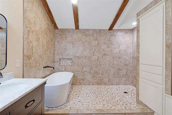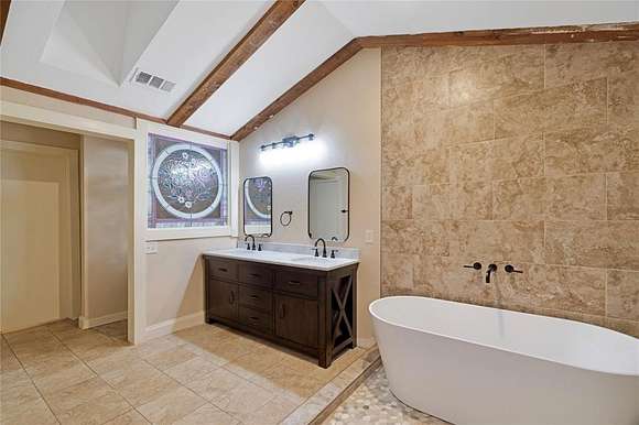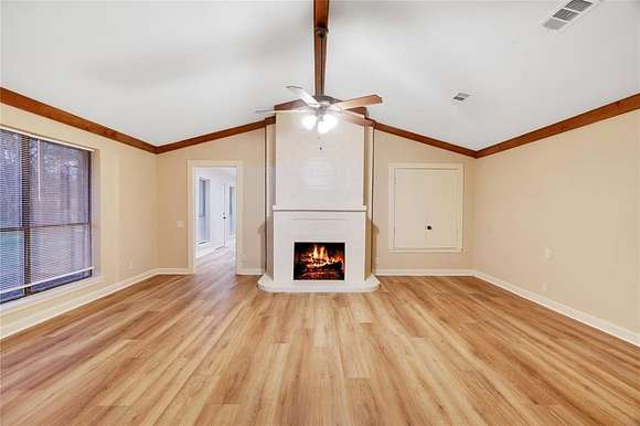 Beautifully remodeled ranch style home situated on 6+ acres in Powderly, Texas!. Boasting over 3,300 sq ft of living with 4 bedrooms 3 full baths and 1 half bath. Split living arrangement, two living areas with wood burning fireplaces perfect for entertaining guest. A formal dining room as well as a bonus room off the front door with a coat closet. Would make for a great game room or kids play place. Primary bedroom offers valuted cielings, fireplace, and bathroom with double vanity and beautiful custom walk in shower and tub. Kitchen offers ample cabinetry and storage, an island with Spanish tile countertops, stainless steel appliances and all electric. Home was remodeled from head to toe in 2024! HVAC, roof, septic, fixtures, plumbing, electric, flooring and paint. Gated entrance, gravel drive, large mature pine trees and a quaint pond ideal for fishing and relaxing. Large front and backyard ideal for outdoor activities, entertaining and pets. A large pear tree on the east side of the house is a favorite for the local deer herd. Exterior is ready for you to add your personnel touch and take this home truly one of a kind!