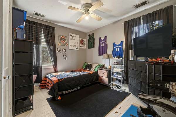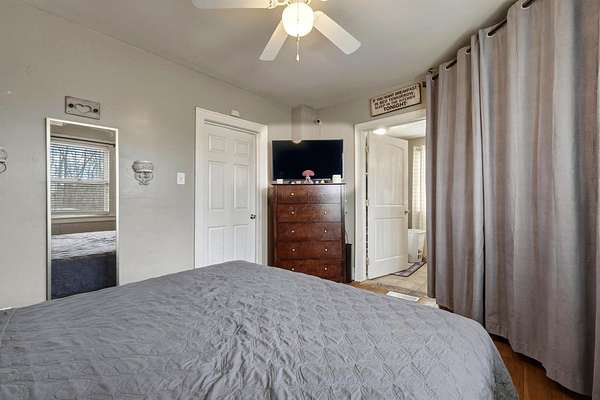 - Ceiling Fan(s), Half Bath Only, Laundry/Utility, Private Bath, Tile Floor, Wood Floor