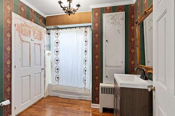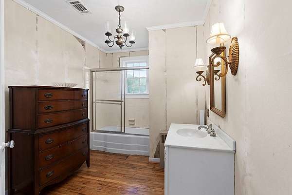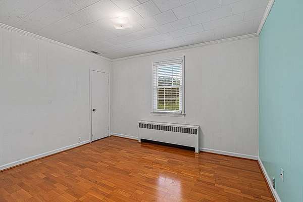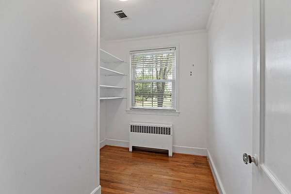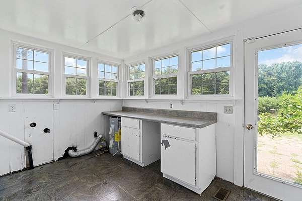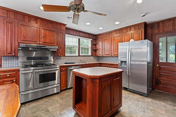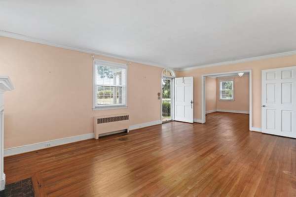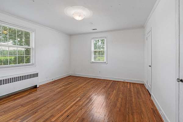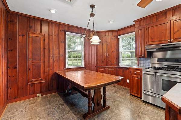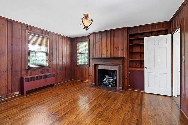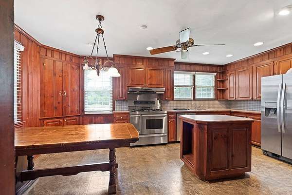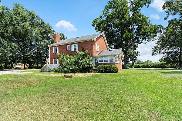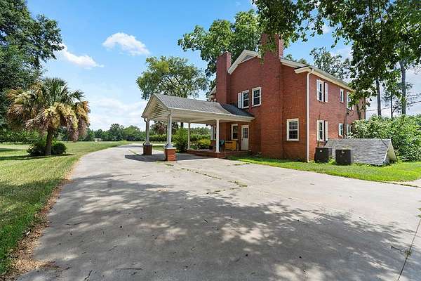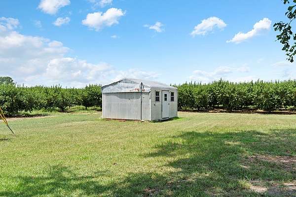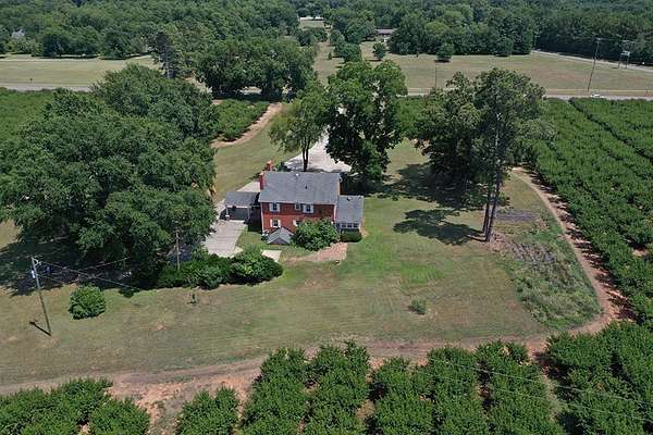 Surrounded by peach trees and a working farm, this 1940 brick Georgian Revival on 3.5 acres is truly the southern American dream. Greeted by the beautiful, original hardwood floors, intact radiators, and a precious fireplace in the living room, this lovely home hearkens back to a beloved, bygone era that the right family can lovingly restore and update into a modern estate. Adjoining the living room, the formal dining room exudes elegance with an exquisite tiered crystal chandelier. Off the formal dining room, the large eat-in kitchen has been updated with stainless, commercial-grade appliances including a 48-inch gas range while the rich mahogany stained pine walls and cabinetry nod to classic early American design. Access to the vast backyard and storage building is through the laundry room off the kitchen, but it could also be used as a sunroom with its multiple windows. Back in the house, the wood paneling extends into the library, complete with a fireplace, making it the perfect place to curl up with a good book, or you could utilize it as an office. In the sleeping quarters, antique glass knobs can be found on every door of the five, sizable bedrooms, with a large walk-in closet attached to the primary bedroom. Two full bathrooms include period appropriate light fixtures and shower/tub combinations. Schedule your tour of this one-of-a-kind estate today!