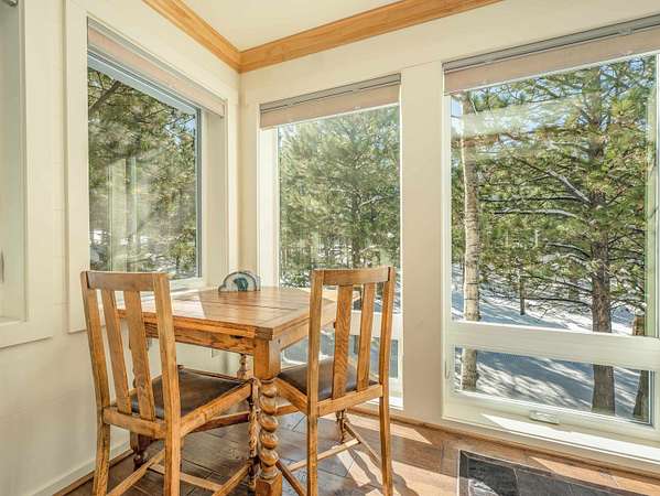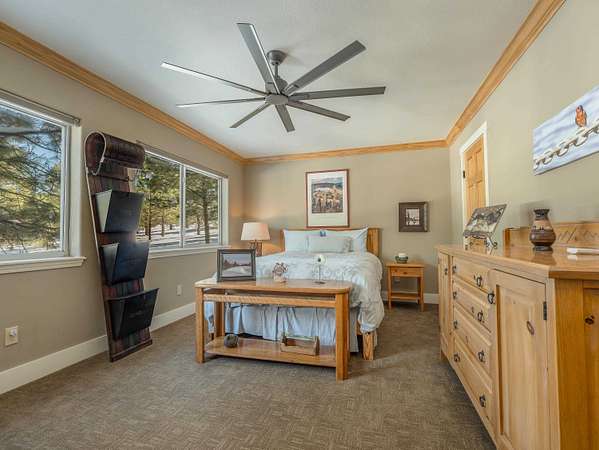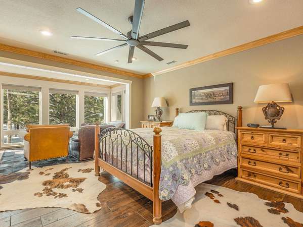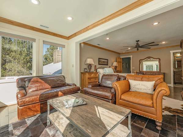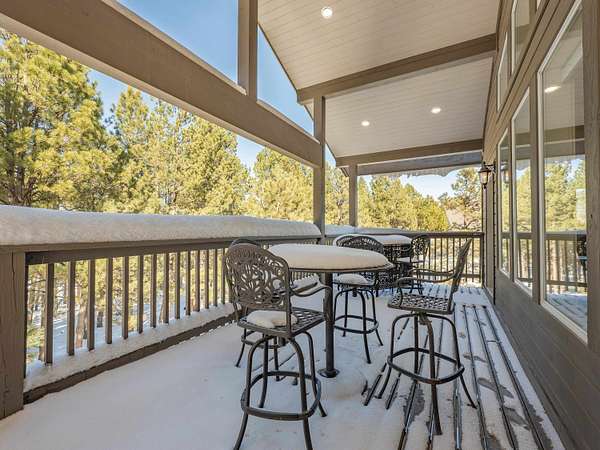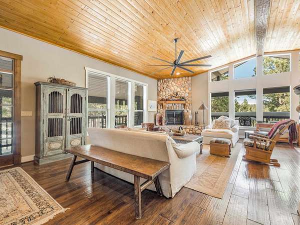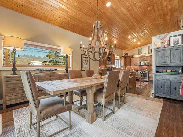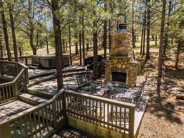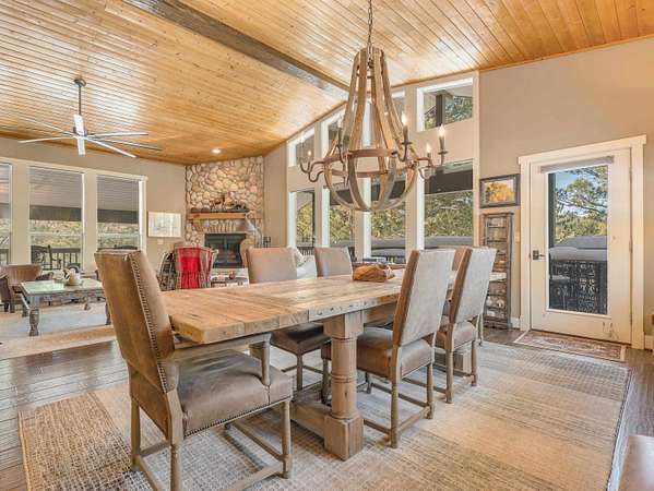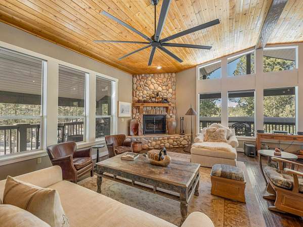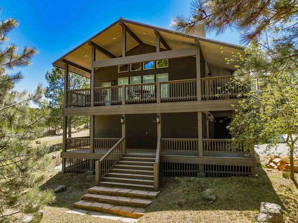 Nestled on an expansive 1.9-acre lot surrounded by whispering pines, this thoughtfully upgraded retreat is just minutes from the Angel Fire Resort Golf Course and Country Club, and a short drive to the ski slopes - offering the perfect year-round mountain escape. Inside, a welcoming great room features a striking window wall framing sunset views of Wheeler Peak and a cozy wood-burning fireplace - the ideal gathering spot after a day of adventure. The upgraded kitchen is generously sized, while the open dining area flows onto a covered deck, perfect for dining al fresco or unwinding under the stars. The spacious primary suite includes a sunny sitting area (or office), updated ensuite bath, and double closets. Two guest bedrooms offer comfort and privacy for family and friends - one with its own ensuite bath. A bonus living space, complete with its own fireplace, is perfect for watching the big game, hosting movie nights, or simply spreading out and relaxing. The attached three-car garage includes a dedicated golf cart bay, storage room, refrigerator, and a bonus bunk room - ideal for a kids' hideaway, hobby space, or overflow guests. Whether you're entertaining or enjoying some much-deserved R&R, 79 Spyglass Hill Road is the perfect basecamp for mountain living at its finest. Sold fully furnished, decorated, and equipped. This is the home you will come to appreciate more every year due to the Seller's pride of ownership and updates including a new roof, new black-top driveway, remodeled kitchen and bathrooms and more.