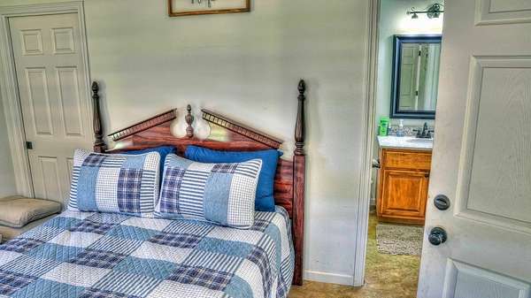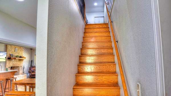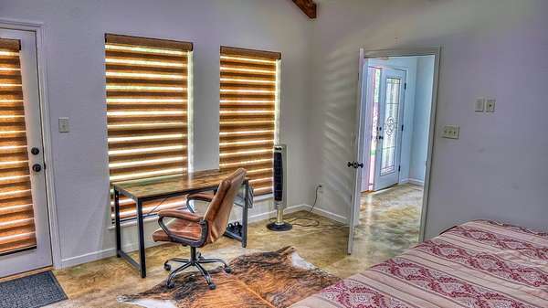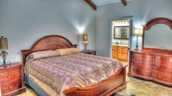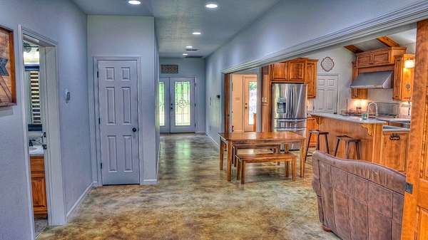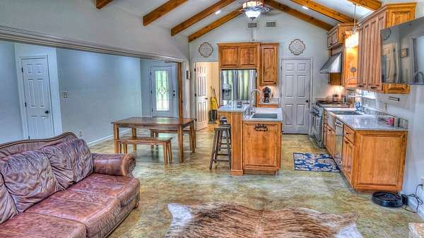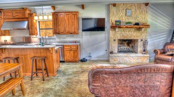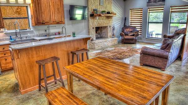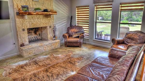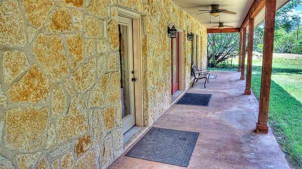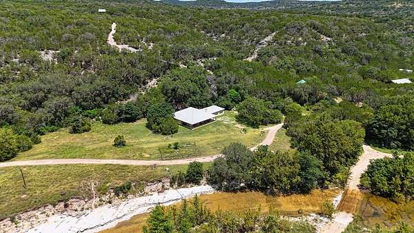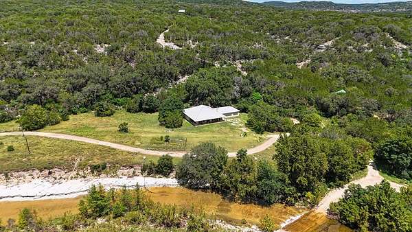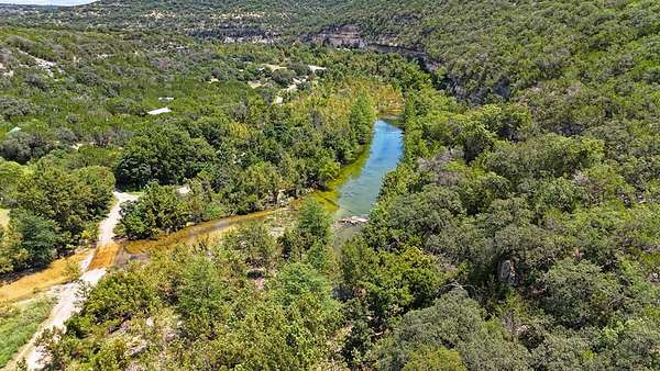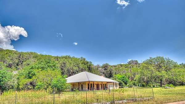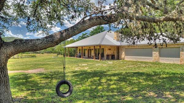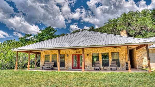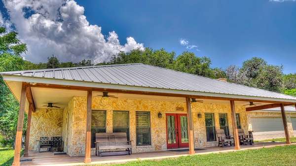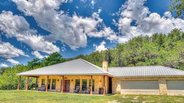 FRIO RIVER FRONTAGE! This home offers a magnificent 5.05 ACRE lot with PRIME WATERFRONT, and gorgeous views. The dogtrot style home features a large, open breezeway running through the middle, w/2 separate living areas on either side, under 1 roof. The central hallway optimizes airflow, making it the coolest spot in the house. The central hallway also separates the private living areas from the kitchen & living room, which also helps to isolate the heat and keep the rest of the house cool. The primary suite showcases a spectacular vaulted ceiling w/wood beams, patio access, his/her walk-in closets, dual vanities & separate tub/shower. A 2nd bedroom and bathroom are located downstairs, with a loft area and half bath upstairs. The functional kitchen features stainless appliances, quartz counters, double oven w/gas cooktop/griddle, farmhouse sink, Maple cabinets & island w/oversized prep sink. Covered porches surround the front of the home and provide more space for outdoor living. A road runs up to the back of the tract on top of the hill and there are several nice building sites or areas to set up a hunting blind.