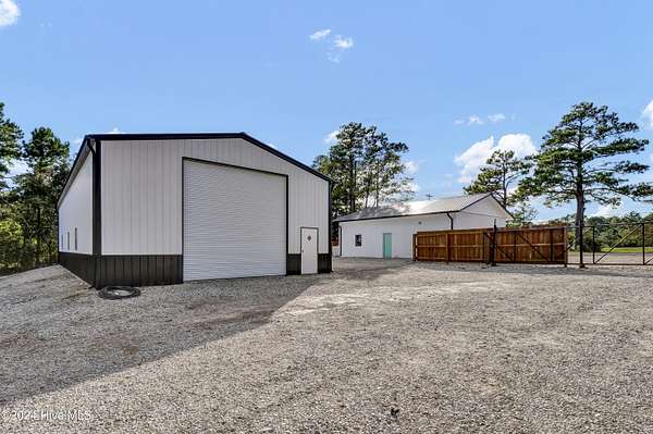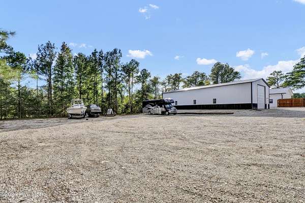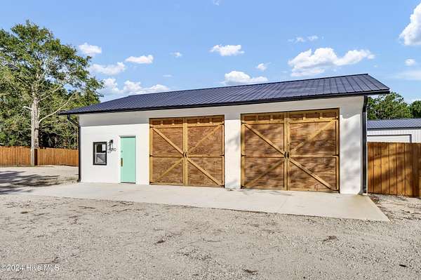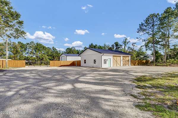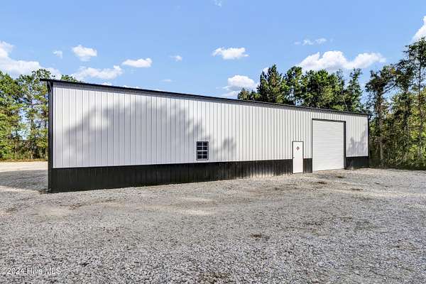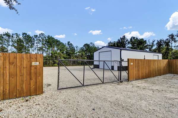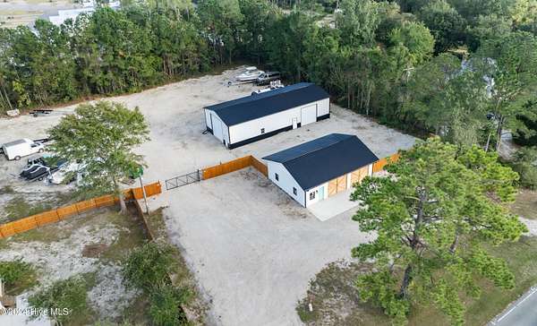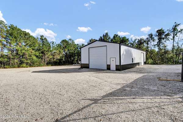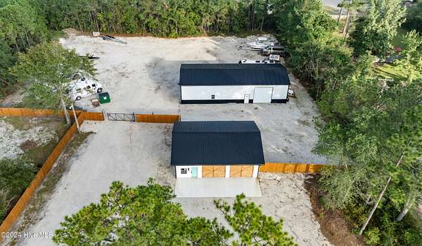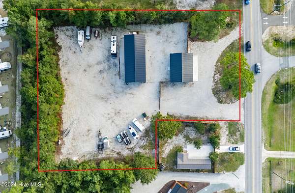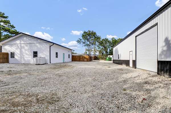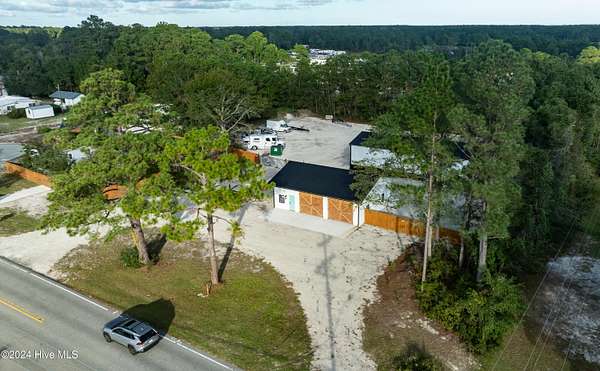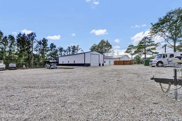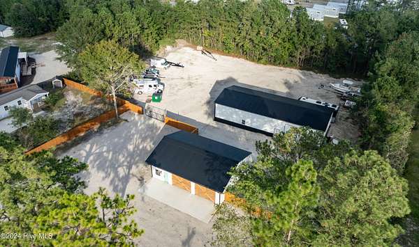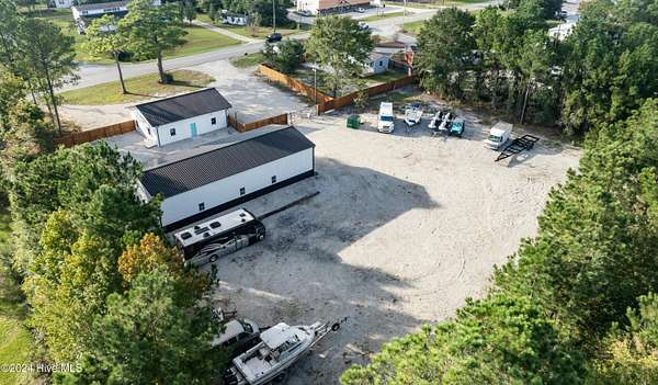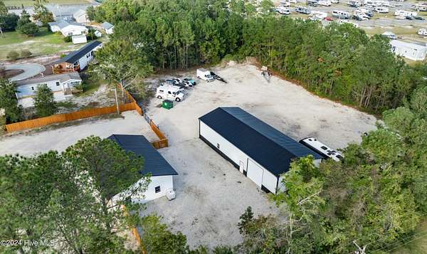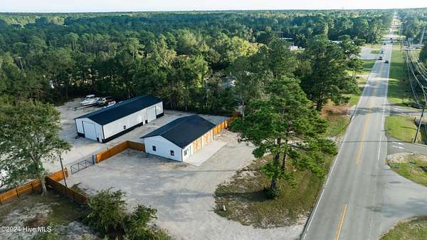 Rare opportunity to own a retail store front with a separate detached metal storage building and a gravel storage lot in the business district of Holly Ridge! Large 2100 sq ft metal warehouse in the rear and 1300 sq ft block building on the road front. Both buildings have new electrical service and both buildings have water. Income producing property with a tenant in place paying $6800 per month on a NN lease until expiration (May 2030) or termination. New septic tank serviced bathroom in the road front building. Front building has a pellet stove for heat source. Owner will give credit towards new heat & air service in both buildings with an attractive offer. There is a large entrance to accommodate heavy equipment and a tall security fence around the rear of the property. Site has been cleared and graded with gravel; owner left a 30 ft buffer of trees around the side and rear.