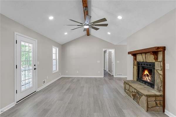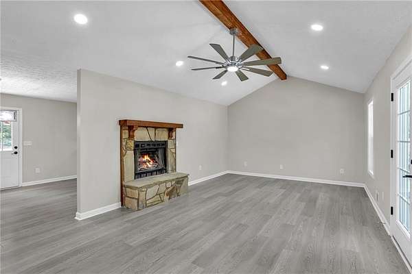 Situated on a stunning 5-acre lot, this beautifully renovated ranch home offers the perfect blend of space, comfort, and rustic charm. From the moment you arrive, you're greeted by a meticulously manicured yard that sets the tone for the peaceful retreat that awaits. Inside, the home features a spacious, open feel highlighted by a striking beamed vaulted ceiling and a gorgeous stone fireplace that anchors the living space with warmth and character. Luxury vinyl plank flooring flows seamlessly throughout, offering both durability and modern style. Step outside and enjoy the best of both worlds... Whether you're relaxing on the cozy front patio with a glass of lemonade, catching a gentle breeze, or entertaining guests on the expansive back deck overlooking your private acreage. A convenient storage shed adds extra functionality without sacrificing the beauty of the landscape. There's no HOA to be concerned with. This property delivers the kind of space, charm, and lifestyle that's hard to find-peaceful, polished, and ready to welcome you home.
