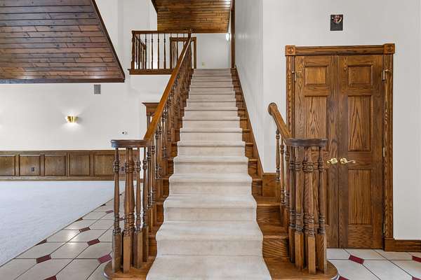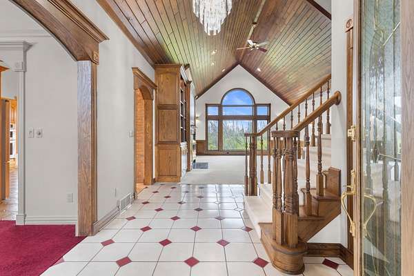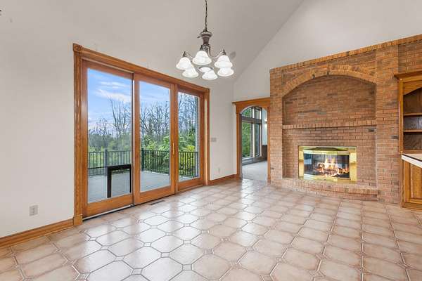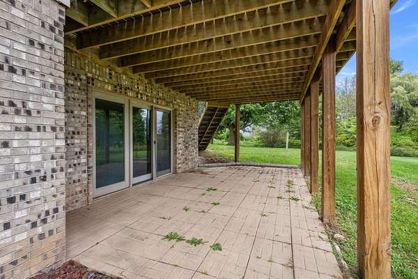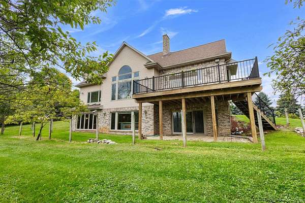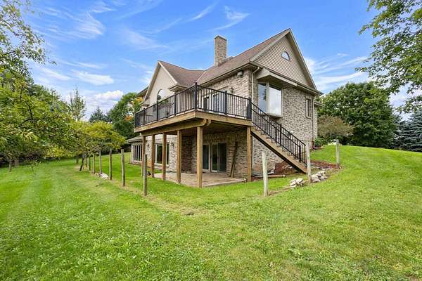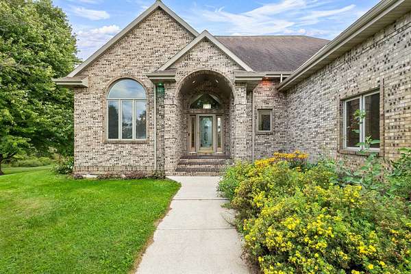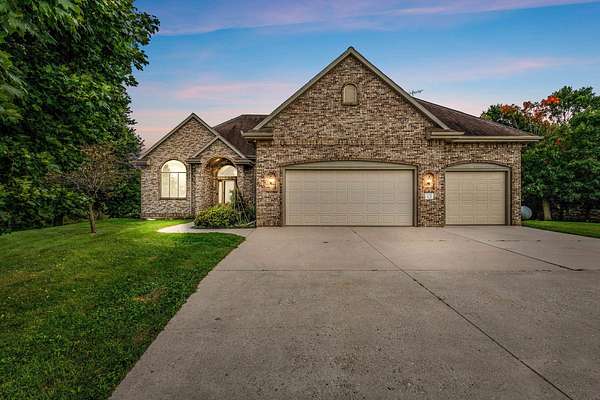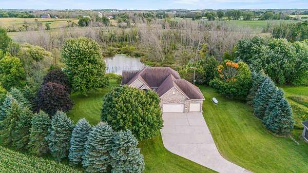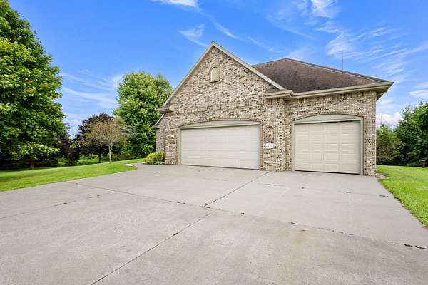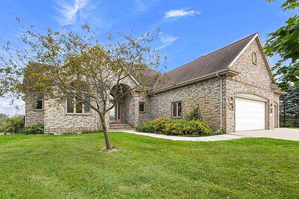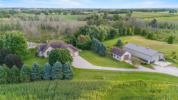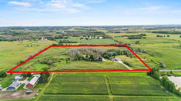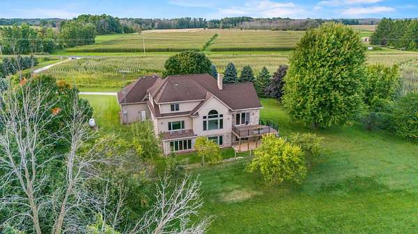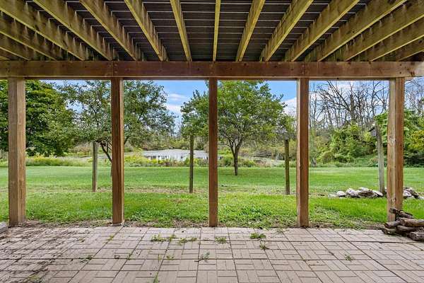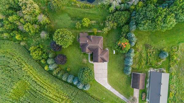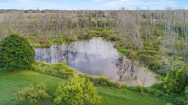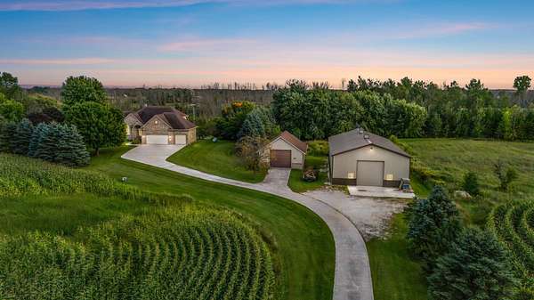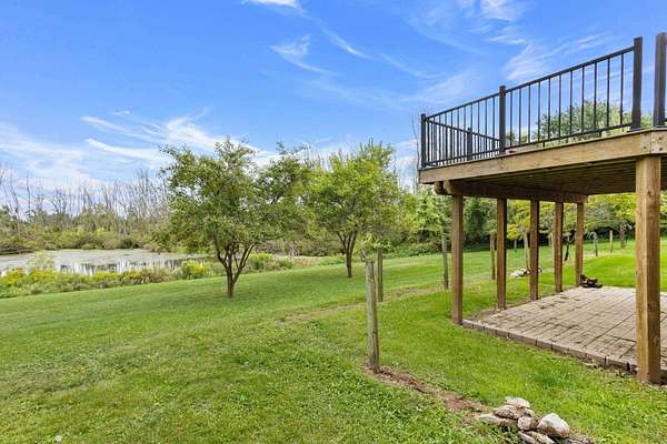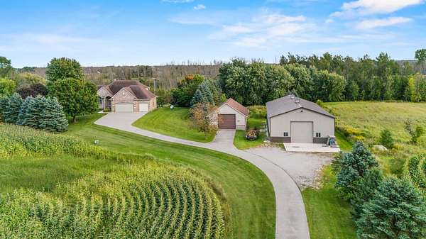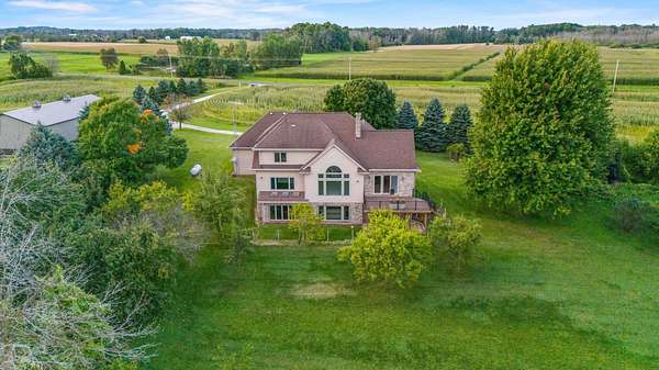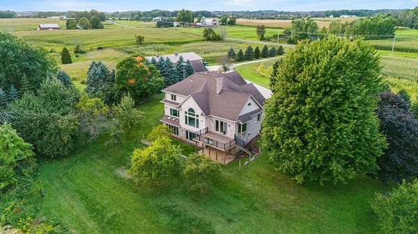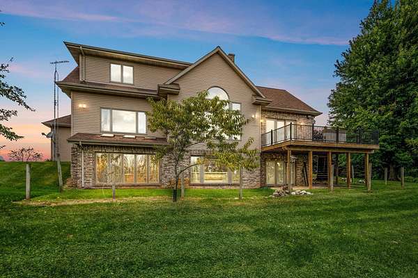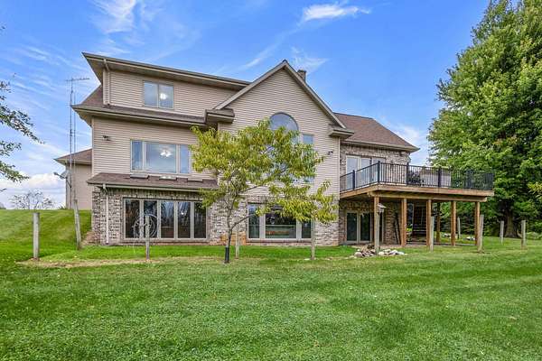 Experience country living at its finest in this stunning brick 2-story home set on 40 private acres with incredible views of nature. Featuring 3 BRs and 3.5 BA, this property boasts a spacious eat-in Kit with a cozy 2-way gas FP a formal dining room, and a main-level primary suite with full BA and walk-in closet. Upstairs offers 2 additional BRs and a full BA, while the finished walk-out LL includes a Fam Rm, Rec Rm, hot tub room, and BA. Enjoy the outdoors with your own private pond and relax on the Trex deck overlooking the scenic landscape. A 3-car attached garage plus two outbuildings (38x29 and 40x87) with concrete floors and large garage doors provide endless storage and workspace. Farmer has the right to take off crops. Being sold AS-IS. Buyer to verify measurements and information.