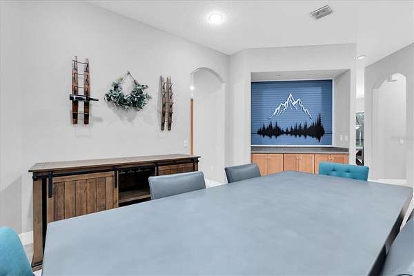- Ceiling Fans(s), Dry Bar, Eat-In Kitchen, High Ceilings, Kitchen/Family Room Combo, Open Floorplan, Primary Bedroom Main Floor, Solid Surface Counters, Solid Wood Cabinets, Stone Counters, Thermostat, Walk-In Closet(s), Window Treatments