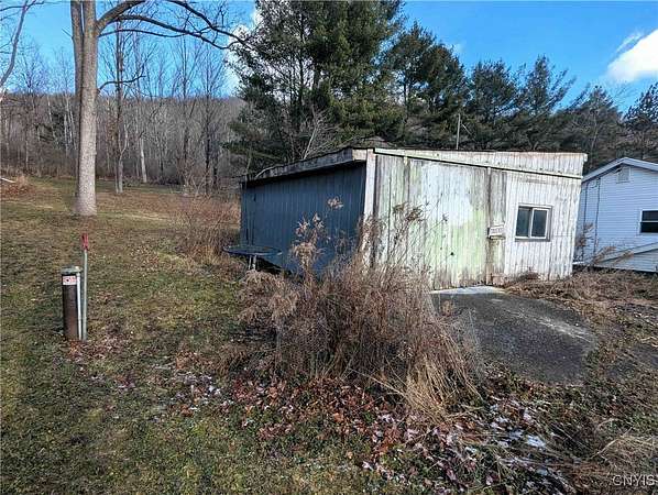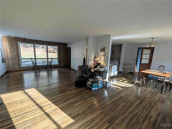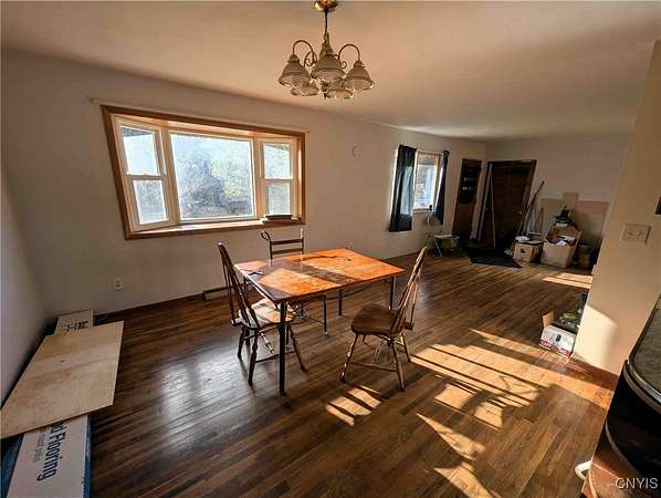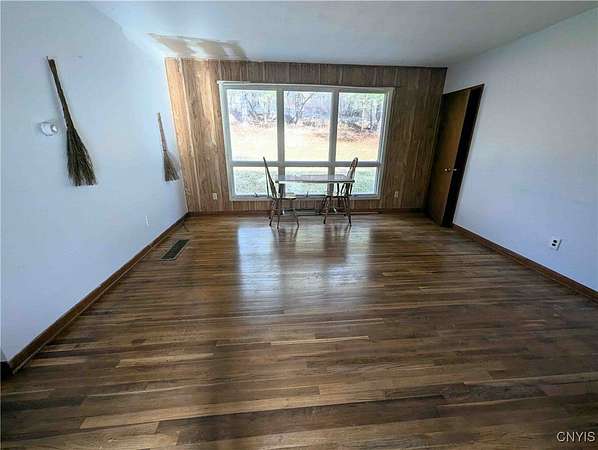 This ranch-style home is located on a large country lot in Thurston NY, Steuben County. The one-story home is situated along a paved road and located just two miles outside the Town of Campbell. Step into the home from the covered front porch to notice the charming hardwood floors and open layout. The corner kitchen is located off the large living-dining room combination and provides a private space for cooking and preparing. There are 2 bedrooms at each end of the home and one full bathroom. The 4-bedroom home is on a full basement with a concrete floor providing a great space for storage, a workshop, or additional living space. The home has a natural gas on-demand water heater and a forced air furnace. There is a small shed on the property used for storage. From the home, the land slopes up the hill with some woods and open ground totaling nearly 3 acres of land. Enjoy this country location and large lot with the convenience of natural gas and high-speed internet.