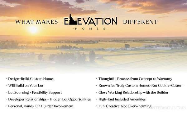 On this beautiful North East Facing 1.2 Acre Lot, Build To Suit Your Custom Home. Experience Elevation Homes' build process of "Custom Homes with Heart and Design-Build with Purpose". Elevation Homes is a boutique custom home builder offering a true design-build experience. We work closely with you from the very beginning - helping you source the right lot, evaluate feasibility, design your home, and walk beside you through every phase of construction and warranty. Elevation Homes is known for custom. We're known for personal touch. And we're known for building homes that feel intentional, elevated, and deeply livable. What makes Elevation Homes different? Design-Build Custom Homes - Will Build on Your Lot - Personal, Hands-On Builder Involvement - Thoughtful Process from Concept to Warranty - Known for Truly Custom Homes - Close Working Relationship with the Builder - High-End Included Amenities - Fun, Creative, Not Overwhelming
