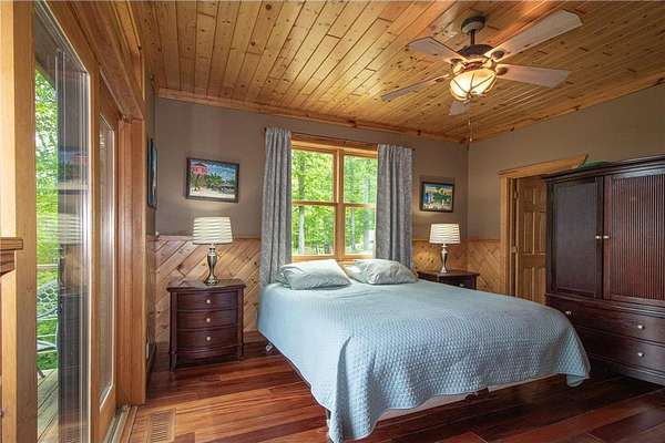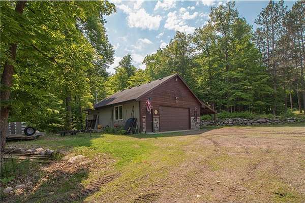 LAKESHORE AND PRIVACY ON LITTLE THUNDER LAKE! This home is absolutely stunning with large lakeside windows for those awesome lake views! Property is 2.3 acres and surrounded by state land. Enjoy your lakeshore home with all of the privacy you could ask for. A nice level yard area at the lake with 171 feet of sand shoreline and a Lakeshore shed. Walk down the solid steps or take a short ride on your ATV down the path to the lake. You really must see this home to appreciate its beauty! Some of the features are: four bedrooms, four baths, floor to ceiling stone wood burning fireplace, attached heated & insulated garage, entry way with 1/2 bath, a detached heated & insulated garage also with lean-to, wood storage area, storage shed, kitchen / dining area with large pantry and patio door to spacious wrap around deck, primary bedroom with suite, walk-in closet & lakeside deck, maple and brazilian cherry flooring, tin ceilings, Marvin DH windows throughout, lots of natural sunlight, main floor laundry, walnut kitchen cabinets, hatchet hewn T & G siding, mud room entering from garage, lower level recreation room /bonus room is roughed in for a bar area, stainless steel appliances, beautifully landscaped property , vaulted ceilings, knotty pine interior, large cement patio, spacious closets and cabinets for all your storage needs. You really should preview this beautiful home. Schedule your showing today.