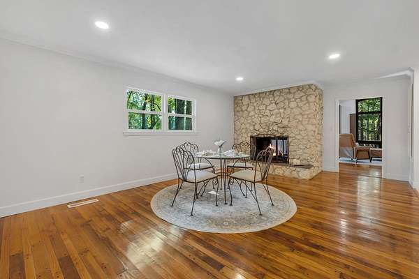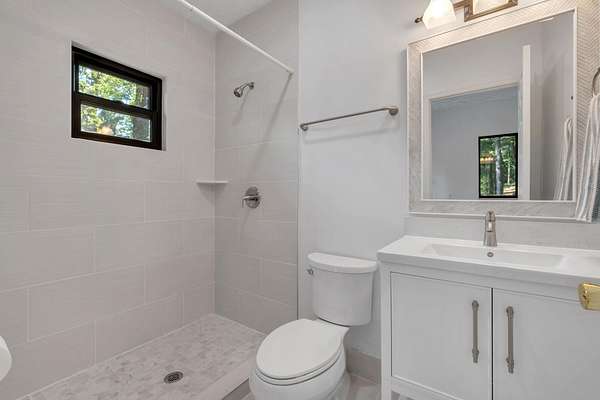 This one-of-a-kind Buck Lake home has been renovated from chimney crown to crawl space, combining rustic charm with modern luxury in a serene 2.35-acre setting. A circular drive welcomes you to the front entrance. Following the hardwood floors to the living room, the gorgeous floor-to-ceiling windows and a dual-sided fireplace create an immediate sense of warmth and style. The open kitchen and dining areas offer seamless flow-perfect for everyday living or entertaining. The chef's kitchen features a striking quartz waterfall island, new appliances, and custom cabinetry, opening to a screened porch through sliding glass doors for effortless indoor-outdoor living. The spacious primary suite is a private retreat with scenic views, two walk-in closets, and a spa-like en suite bath complete with a soaking tub and rain shower with tower system. A second bedroom with its own en suite opens to a large patio surrounded by tiered garden beds-ideal for quiet mornings or evening gatherings. Outside, a detached garage includes a lean-to for extra parking and a workshop space for hobbies or storage. Just 30 minutes from the Capitol and universities and 10 minutes to shopping, this thoughtfully updated home offers peaceful country living without sacrificing convenience. From top to bottom, every detail has been carefully considered-making this a truly turnkey property unlike any other.