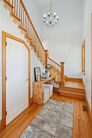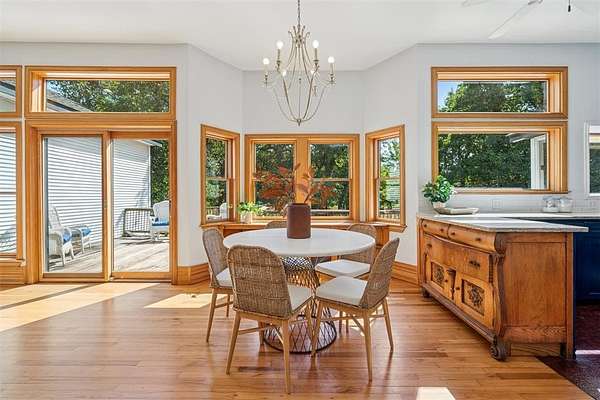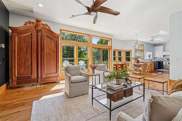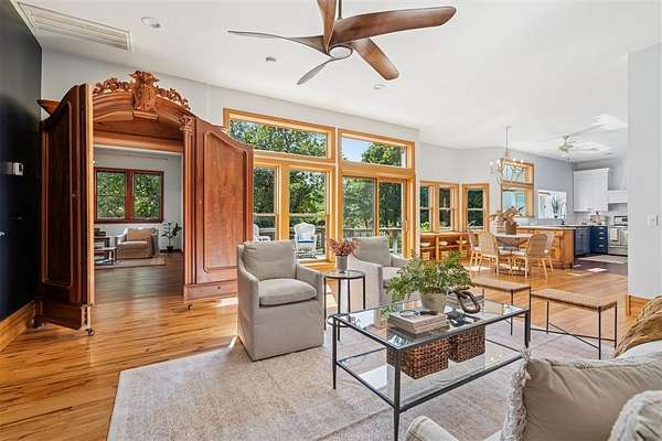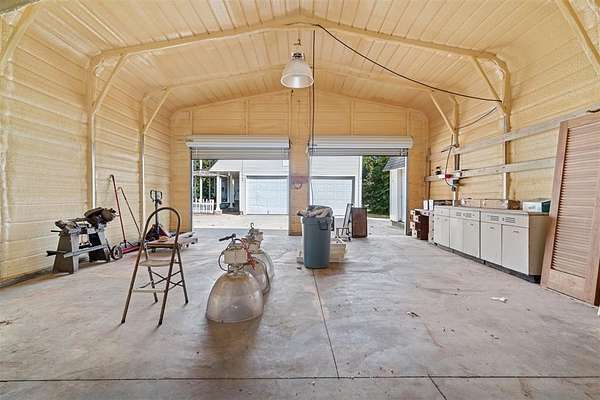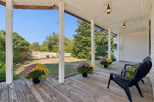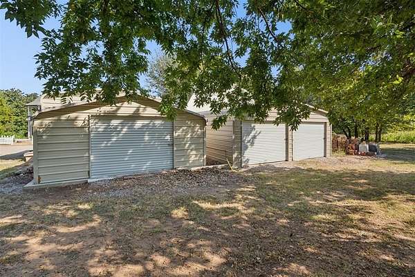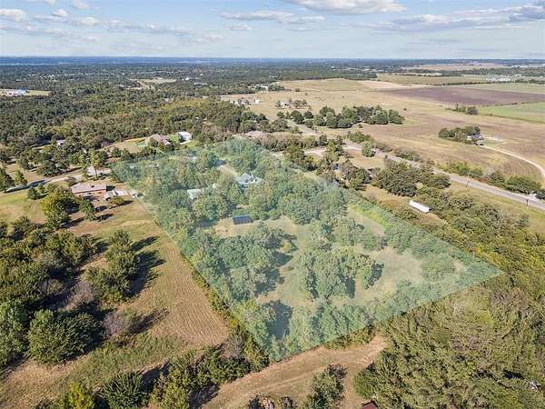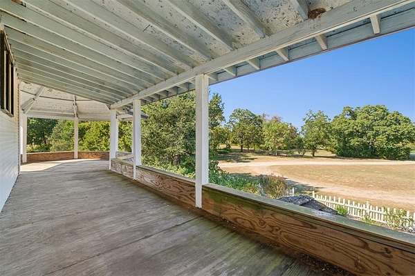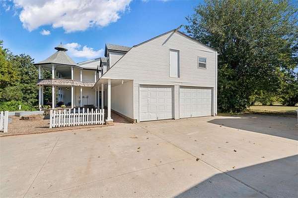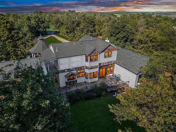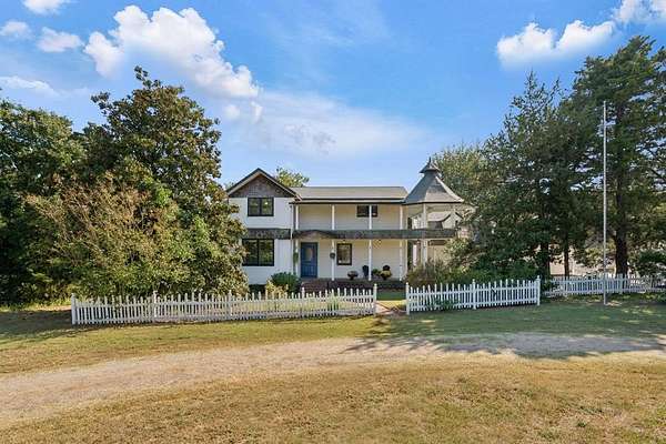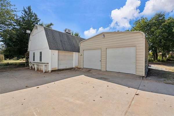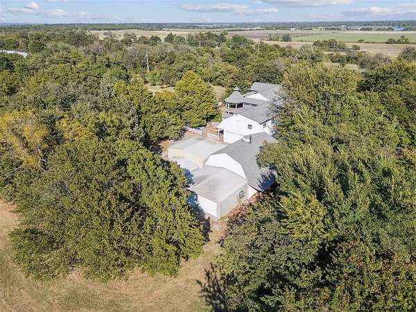 A rare opportunity to own a one-of-a-kind custom home with timeless charm-complete w/ 2 primary suites & 8-car garage capacity-nestled on 5 wooded acres in East OKC Oakdale w/ Jones Schools. This home is anything but ordinary. A wide wrap-around porch & turret-style entry set the stage for a property full of surprises. Inside, soaring ceilings, rich wood floors & floor-to-ceiling windows bring in natural light & serene views. The updated chef's kitchen is both stylish & functional w/ stone countertops, abundant cabinetry, commercial range, dual sinks & a bold crocodile-style floor. The spacious dining area flows seamlessly into the living room, where you'll discover one of the home's most unique features: a built-in cabinet that doubles as a hidden doorway into the downstairs primary suite. This private retreat offers its own sitting room (w/ movable built-ins), a spa-like bath w/ marble counters, elegant dual vanities w/ designer lighting, a walk-in shower w/ new tile & dual closets-including a massive "closet room" ready for customization. The suite also has a private laundry & a secluded patio. Upstairs adds 2 bedrooms w/ full bath, plus a 2nd primary suite w/ a spacious sitting area, clawfoot tub, walk-in shower, large closet & its own balcony. Outdoors, the possibilities are endless: a detached 2-car garage w/ workshop & office space, plus an upstairs ~950 sf unfinished apartment (electric & sheetrock started), offering tremendous potential for a guest house, studio, or rental. 6 additional garage bays bring the total to 8 w/ expansive concrete driveways & storage options that make this property ideal for car collectors, hobbyists or business use. Dedicated work areas & built-in shelving provide ready-to-go shop space. A large deck, mature trees & a ground-mounted solar panel system round out this rare find. Brand new roof! Character, creativity, & versatility-all in the perfect location. Enjoy a country feel just minutes from Edmond, OKC, I-35, & the Turnpike.