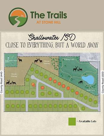 Welcome to The Trails at Stone Hill, one of the most unique and thoughtfully designed residential communities in the region. This exclusive neighborhood offers luxury 1-acre lots, giving you the rare opportunity to build your dream home on a spacious piece of West Texas land. Nestled within the award-winning Shallowater ISD, The Trails at Stone Hill combines convenience with a true sense of retreat. Enjoy more than 20 acres of recreational space, complete with a serene pond, mature trees, and over a mile of scenic walking trails that wind through the natural landscape. The expansive nature area brings a peaceful, almost storybook charm to the community, sheep, ducks, and deer can often be spotted grazing or wandering nearby, adding to the quiet beauty that makes this neighborhood so special. Despite its private, country-like setting, you're just 10 minutes from Texas Tech University, downtown Lubbock, and the medical district. It's close to everything, but truly a world away. If you're searching for a slice of West Texas paradise, a place to create a legacy home surrounded by nature, space, and unmatched tranquility look no further than The Trails at Stone Hill.