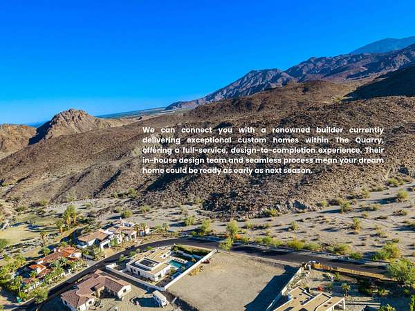 79212 Tom Fazio South | The Quarry at La Quinta Positioned within the gates of The Quarry at La Quinta, this .65-acre homesite offers an extraordinary opportunity to create your own architectural statement against a backdrop of unobstructed, dramatic mountain vistas and pristine desert landscape. One of the few remaining parcels in this exclusive enclave, the property captures both morning and evening light an ideal canvas for a custom residence designed for serenity, sophistication, and style. Imagine starting each day surrounded by the quiet beauty of the desert, your terrace overlooking the rugged Santa Rosa Mountains, your home crafted exactly to your vision. We can connect you with a renowned builder currently delivering exceptional custom homes within The Quarry, offering a full-service, design-to-completion experience. Their in-house design team and seamless process mean your dream home could be ready as early as next season. Adding to its appeal, ownership here places you within one of the desert's most prestigious communities without paying high HOA fees. The location is exceptionally convenient just a short drive to The Thermal Club motorsports facility, the Desert International Horse Park in Thermal, and the valley's renowned polo grounds while remaining tucked away for a quiet, refined desert lifestyle. Beyond the homesite, The Quarry at La Quinta is home to the only Top 100 Golf Course, in the Coachella Valley masterfully designed by Tom Fazio. Recognized by Golf Digest as one of America's greatest private courses, it delivers an unmatched golf experience. The community also features a 10-hole Short Course, ranked among the world's Top 25 Par-3 layouts, and an 18-hole putting course, offering variety and challenge for every golfer. A rare blend of privacy, prestige, and potential, this property invites you to bring your vision to life and establish your custom retreat. Contact us today for details and to explore the possibilities at The Quarry at La Quinta.