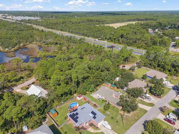 From US-98 Navarre Parkway, turn south at the traffic light onto Thresher Drive. Continue straight until Thresher Drive dead-ends into Newport Street, then turn right. Follow Newport Street as it curves, and the property will be on your right.