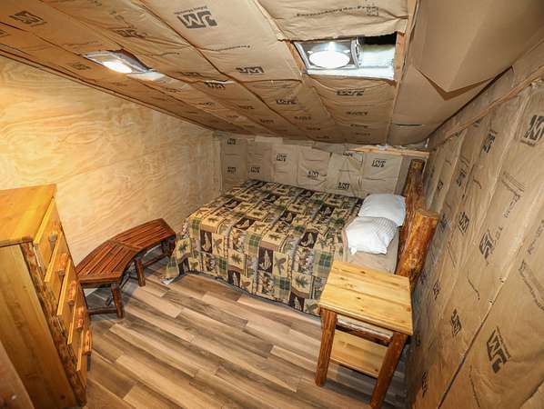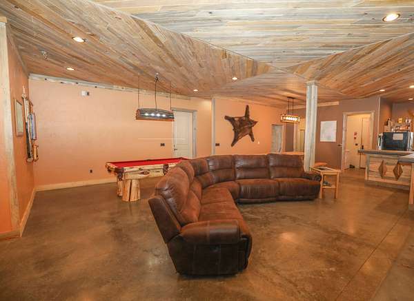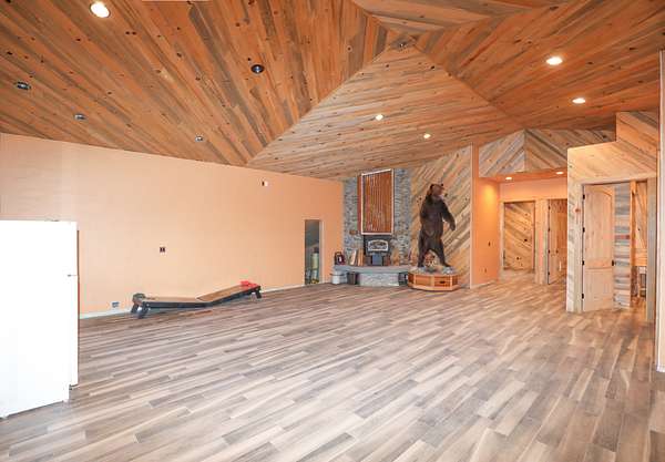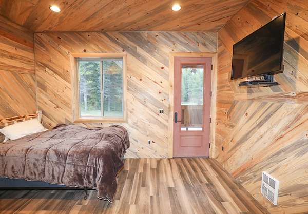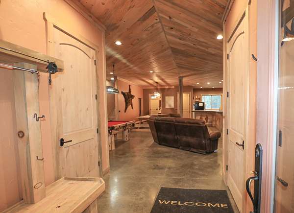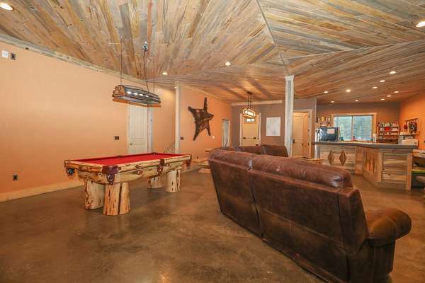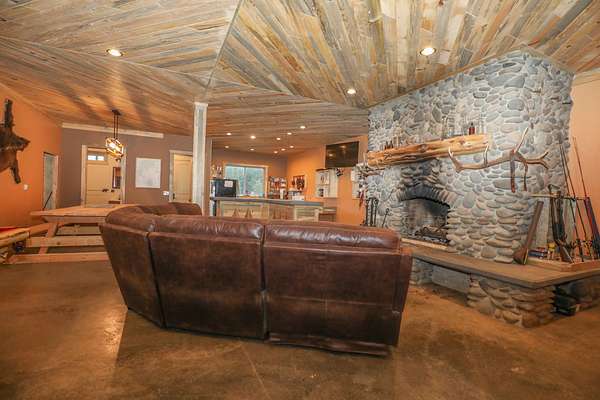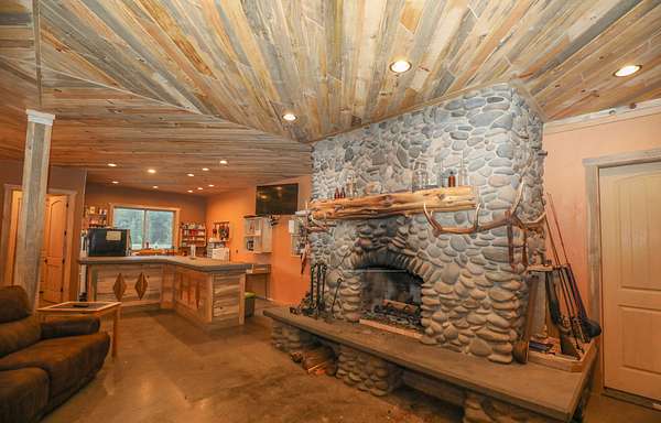 A custom-built lodge sits in the perfect setting next to the pond. It was built in 2016 and features 6 bedrooms 4 bathrooms, and 2 attached RV garages. The main level features an open living area with concrete floors, a wood panel ceiling, a kitchenette with an island, and a large river rock fireplace. Upstairs is the newly finished master bedroom suite, additional guest bedrooms, and a bonus room with a fireplace. The lodge has 2 covered decks on either side. One overlooks the pond and the other overlooks the 3 tent decks. There is a bunk room with private access from the outside that features a shower room and a full bathroom. The bunk room is perfect for guests using the tent decks.