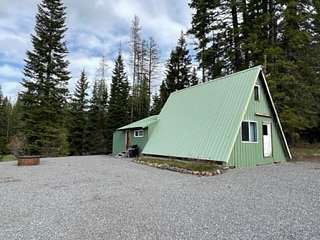 Beyond the lodge is a 1960s A-Frame cabin with a loft bedroom and wood stove. The cabin is 868 sq ft and is powered by a generator.