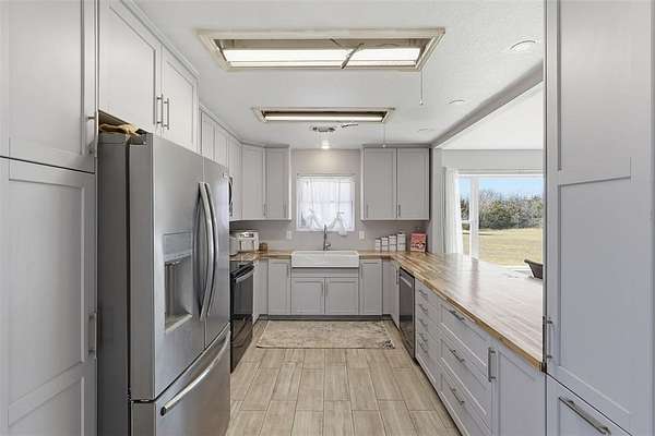 Set back from view with gated access, this private homestead features a 3-bed, 2-bath main home with extensive upgrades: roof (2023), HVAC (2024), windows (2025), new interior doors, paint, fixtures, thermostat, and tile in the bedrooms (5 years old). The kitchen is fully updated, featuring 10K in new cabinetry and modern finishes. The guest bath includes a newly replaced shower and a new vanity and sink.