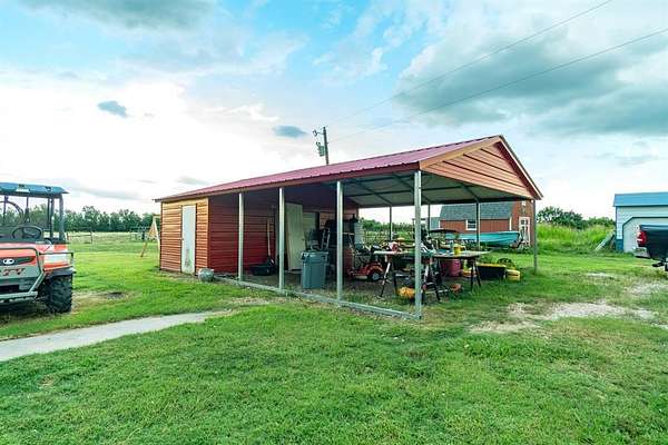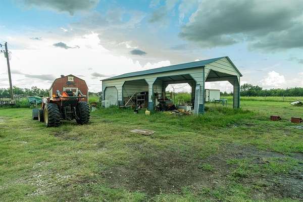 The property also includes a 12x16 barn with a storage loft, a 10x20 red storage shed (spray foam insulated) attached to a two-stall carport, and an 8x20 blue shed attached to a three-stall carport. Additional features include a fenced garden and a livestock feeding and grazing area. The entire property is fully fenced and extremely private. The main home is not visible from FM 68 or Hwy 78. Property may be subdivided.