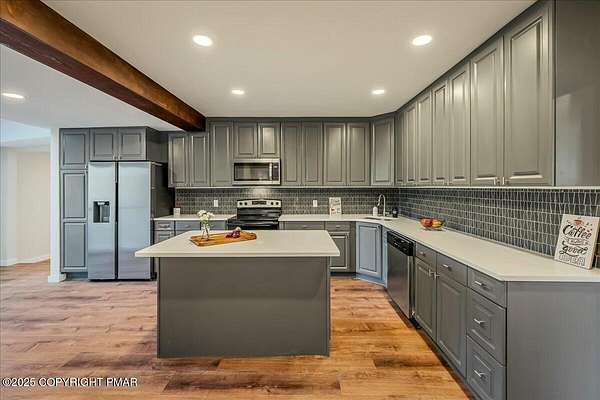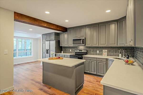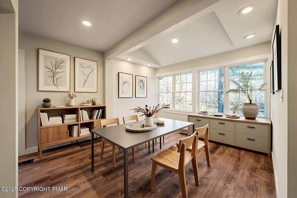 - Beamed Ceilings, Breakfast Nook, Built-In Features, Eat-In Kitchen, Kitchen Island, Recessed Lighting, Stone Counters, Vaulted Ceiling(s), Walk-In Closet(s)