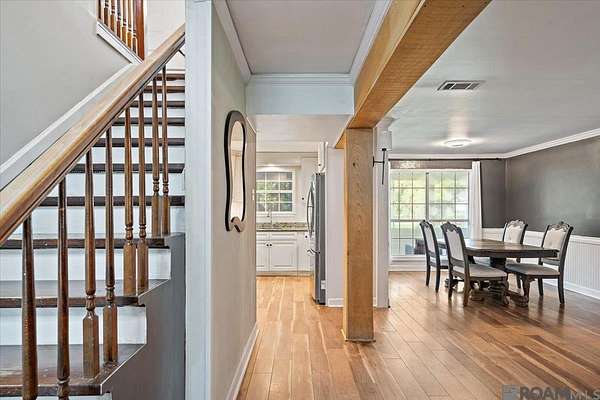 This inviting two-story home offers 4 bedrooms, 3 1/2 baths and 2,821 SqFt of living space nestled on 2.8 beautiful acres between Baker and Central. The property boasts mature shade trees, an 840 SqFt workshop, a shed, and a screened wrap-around porch where you can relax and enjoy peaceful country views. Inside, you'll find granite countertops, stainless steel appliances, and plenty of custom cabinets in the kitchen, which opens to a versatile flex room perfect for a breakfast nook, office, or keeping room. The generous living room features wood flooring, ample natural light from large windows, and a brick fireplace with built-in recesses. On the main floor, there's a spacious bedroom with a full bath that could serve as either a primary or guest suite. Upstairs, there are 3 additional bedrooms and a roomy bath with double vanities and a garden soaker tub. The upstairs primary bedroom includes its own sitting area and fireplace, while a 390 SqFt bonus room with a kitchenette and full bath can serve as a great apartment or guest suite. Outside courtyard and patio areas offer plenty of space for entertaining guests. This home provides an abundance of flexible spaces--schedule your private tour today!