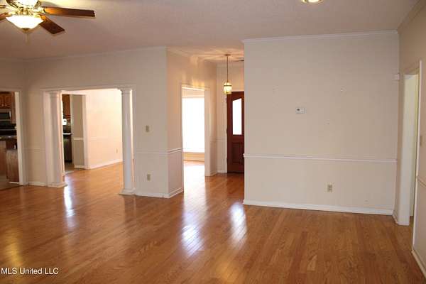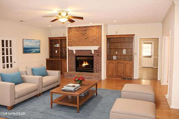 Located in Hunter's Run Subdivision, this exceptional one level home offers 4-bedroom, 3 full-baths on a 1.53 acre lakefront lot in a cove within an established neighborhood. The spacious great room features hardwood flooring, brick hearth fireplace with gas logs, and built-in bookcases, with hardwoods extending into the formal dining room. French doors open to sun room showcasing pretty lake views-perfect for relaxing or entertaining. The updated kitchen offers large breakfast table area, granite countertops with island, separate built-in desk area, walk-in pantry with decorative frosted door, abundant cabinetry with modern hardware, stainless steel smooth cooktop stove and dishwasher, plus refrigerator to remain. The large primary suite includes hardwood flooring, a generous walk-in closet, and a salon bath with corner tub and jets, separate shower, two vanities, linen closet, and tile flooring. Desirable split-bedroom plan features two bedrooms served by remodeled Jack-and-Jill bath-one with two closets and the other with built-in bookcases and large walk-in closet. Fourth bedroom on the opposite side of home offers an ideal in-law area with private full bath, large walk-in closet, and lake views. Additional amenities include oversized laundry room with cabinets and folding counter plus built-in ironing board and washer/dryer to remain, walk-up attic that could be finished for additional space or storage, pull-down attic stairs in the garage, and attached double garage with third stall workshop area and walk-through exterior door. The home is loaded with closet and linen storage, extra-large rooms throughout, window coverings, and built-in features. Outdoor living shines with lake views, rear patio, plus side courtyard with brick wall border and picket-fenced lawn area on the front side of the home, along with covered front porch. Conveniently located near all the shopping, dining, medical offices, churches, and golf courses that Olive Branch offers-this lakefront home delivers space, comfort, and timeless appeal. Some photos virtually staged.