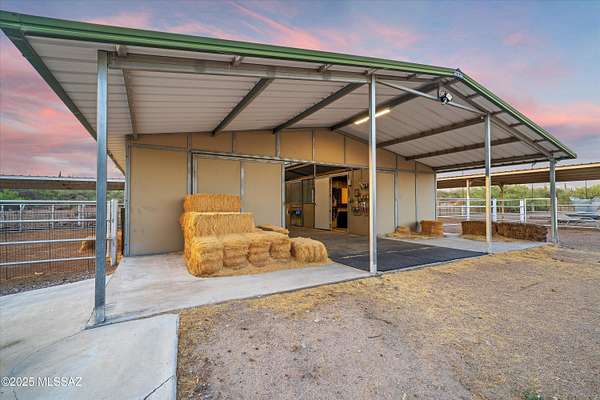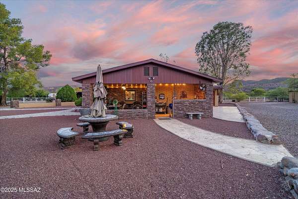 5.74 acre ranchette horse property in Aravaipa, with private access to miles of BLM and state land. Complete equestrian training set up, with LED-lit team roping area, barns, multiple fenced/shaded paddocks, and enough storage for 1.5+ semi-loads of hay. This meticously maintained property is completed fenced and gated, with video survelliance for security. Generac propane generator along with a private well allow you to continue living normally during a power outage, with the potential for offgrid living. The impressive block home features a 50 year rated metal roof, new Renewal by Anderson windows, recently installed dual unit HVAC system, and premium finishes: granite countertops, stainless appliances, custom knotty alder soft close cabinetry, custom rock fireplace, and tile flooring throughout. Primary bathroom features soaking tub and separate shower, with intricate tile surrounds. Huge primary walk-in closet with custom shelving and two wall safes. The off-kitchen laundry room features additional storage cabinets, an upright freezer, and large sink. Relax in the covered outdoor kitchen area, with sink and grill. The expansive acreage features 9 carport bays, drip irrigation/ 20+ hose bibs for watering, a private workshop with wood-burning stove, along with multiple outbuildings and a tremendous amount of storage. The productive private well has a 1500 gallon tank with recently replaced booster and well pumps. Home features Ecowater softener/filtration system, along with RO at sink for drinking water. Stone and block main entrance features designer custom gates, and home is surrounded by travertine walkways/patios. Corrals use schedule 40 and schedule 80 piping, along with welded wire fencing. Enjoy rural living and incredible mountain views, only 40 minutes from Oro Valley. No HOA! Property uses a Winkelman/Dudleyville zip code, but is located in the Aravaipa canyon area.