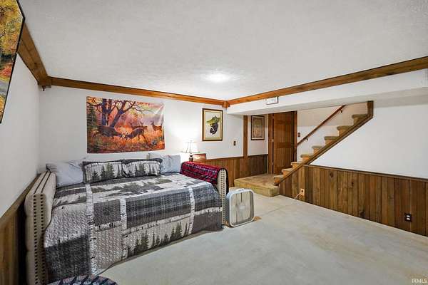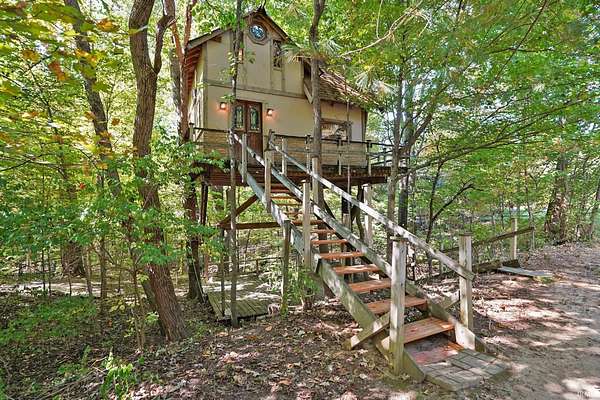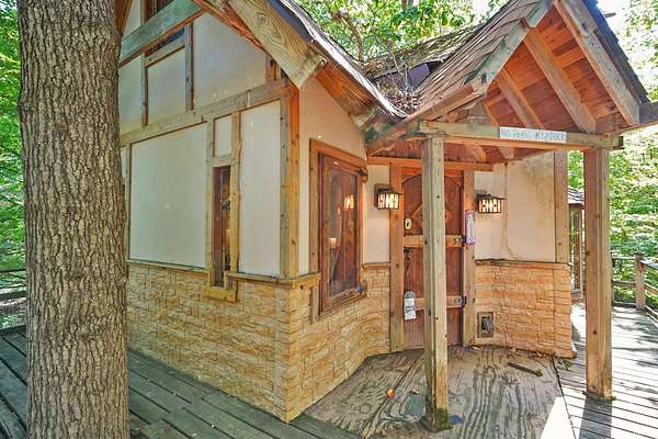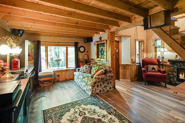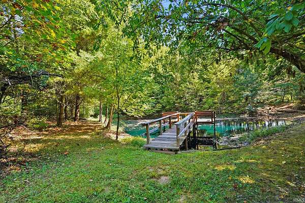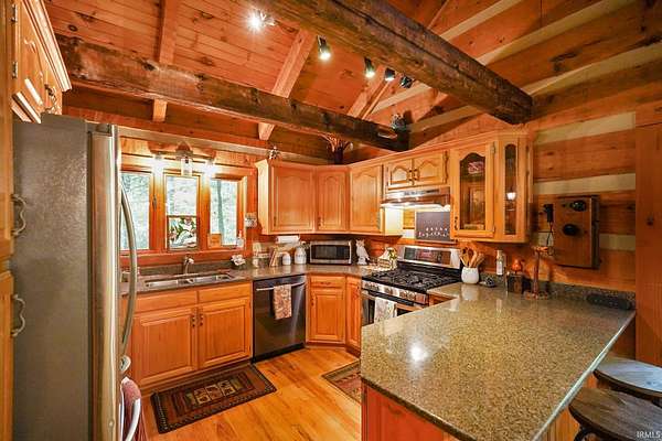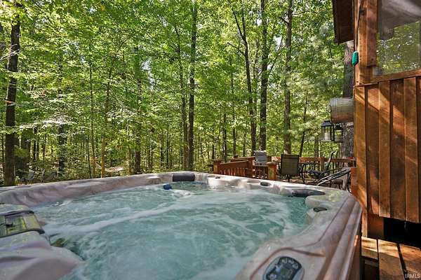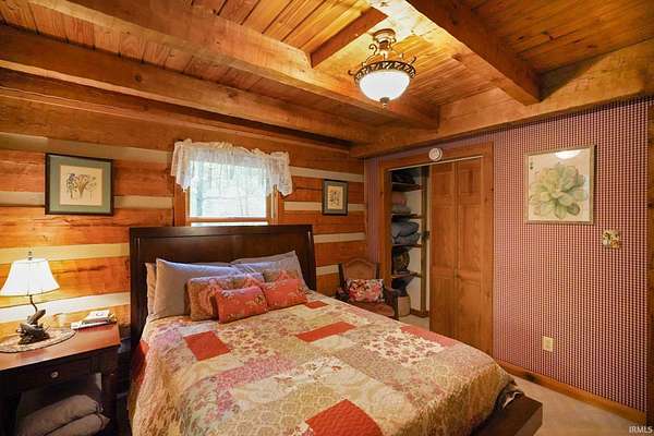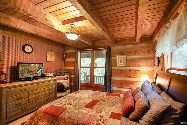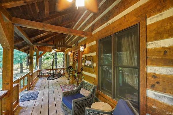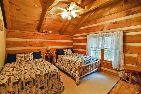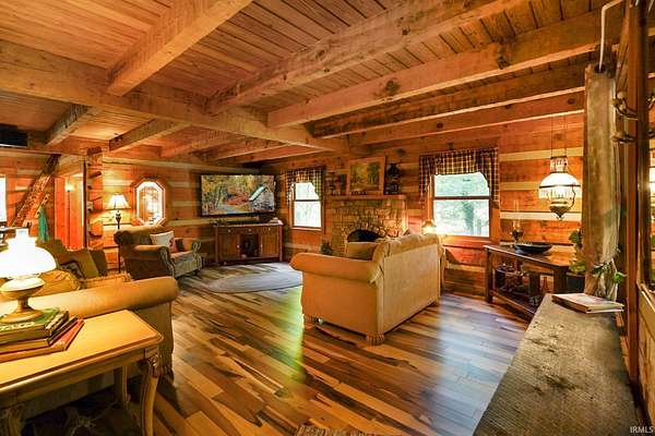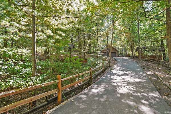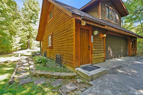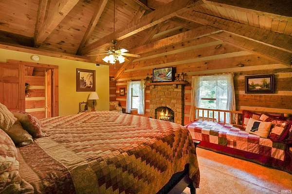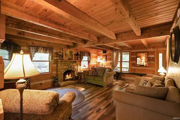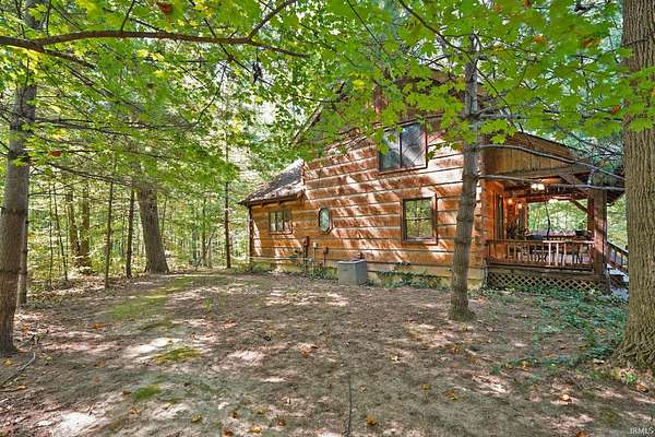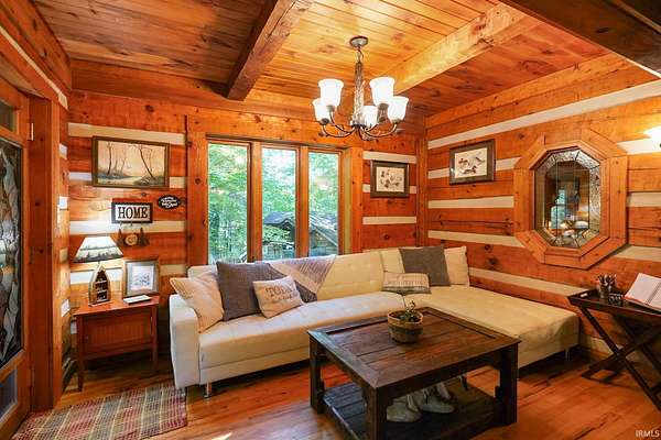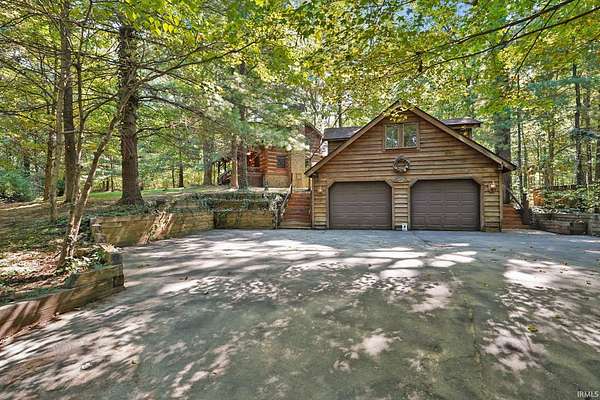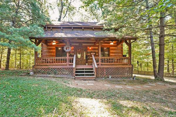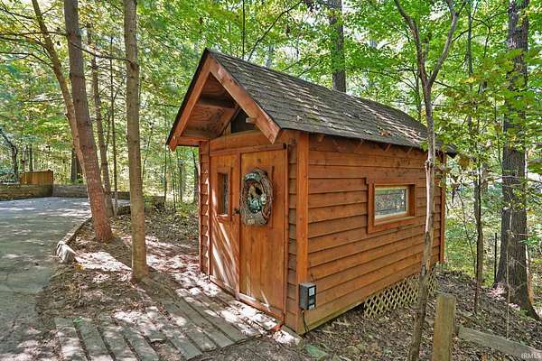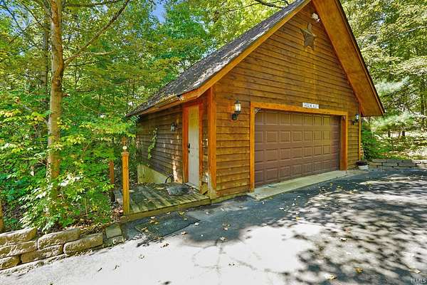 Magical Brown County Retreat with Lake, Hobbit Treehouse & Tourist Rental Approval ooo Tucked into 5 pristine, wooded acres in one of the most sought-after areas of Brown County, this beautifully maintained log chalet is more than just a cabin -- it's an experience. With a track-record of performance as a short-term rental, full STR zoning approval, and a captivating mix of natural beauty and curated charm, this property offers immediate lifestyle and investment appeal. ooo A serene private lake with a dock and seating area welcomes you with tranquil views, while Edison bulb string lights line trails and winding walkways lead guests through enchanting outdoor living spaces, past a campfire area, hot tub, and into moments of total peace and privacy. ooo The main home exudes rustic elegance with hand-hewn timber beams, but the magic continues across the property -- with six additional outbuildings, including garages with potential studio apartments, and the show-stopping Hobbit-like treehouse tucked into the trees. Every corner of the property is thoughtfully designed for relaxation, exploration, and connection. ooo With a gated entrance, remote-yet-accessible location, and grounds that could easily host intimate weddings, retreats, or events, this property is turn-key and truly one-of-a-kind.