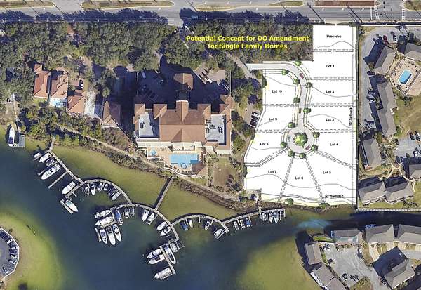 Property is zoned High Density Residential and is part of the Marbella Condominium Project. This parcel has a current Development Order for a second tower for 52 residential Condominiums. The development may possibly be amended for single family homes or townhomes. Infrastructure for sewer, water, underground infrastructure including Electric Conduit has been completed and a ''Certificate of Completion issued by City of Destin. This parcel has over 300' water frontage on the Destin Harbor. A Survey is available along with copies of the Marbella Master Condominium Project. Listing Broker/Salesperson has ownership interest in the property.