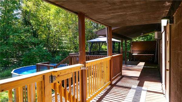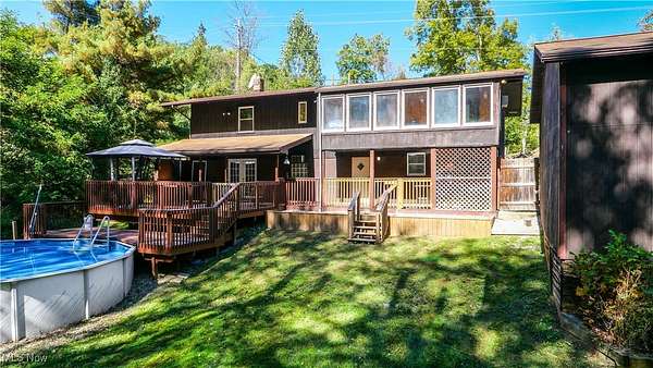 Experience country living in this rustic 3-4 bedroom, 2 full bath raised ranch on 3 partially wooded acres. Cross over the bridge to enjoy a flowing creek and go exploring with plenty of land behind the home for outdoor fun. A versatile in-law suite adds a private entrance, large bedroom, walk in shower bath that is handicap accessible, full kitchen and French doors that open to the backyard, multi level decks and the pool! While upstairs, you will appreciate hand hewn cedar vaulted ceilings and walls for that cabin feeling- a glass sunroom off the kitchen, overlooking the wooded backyard and stunning views. Many recent upgrades in the last 2-3 years, including but not limited to- Roof, double pane windows, owned water softening system, boiler for furnace, leaf guards, pool liner, electrical panel, hot water tank and converted in-law suite.The front yard is fenced for privacy or your pets and has an ornamental pond complete with Koi fish- A two car garage with heated workshop with 220v electric and oversized carport for additional storage. All just minutes from town conveniences and Hiram College, yet centrally located to Cleveland, Akron or Youngstown. This home has so much to offer the next owner and with immediate occupancy, you can start enjoying your new home right away!