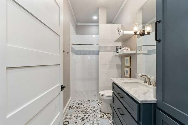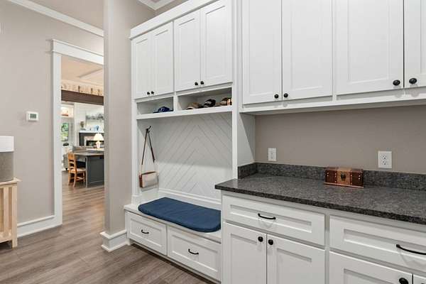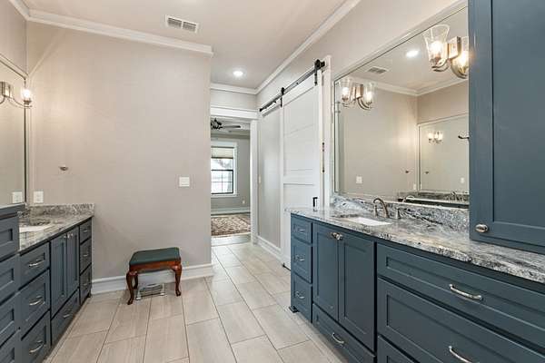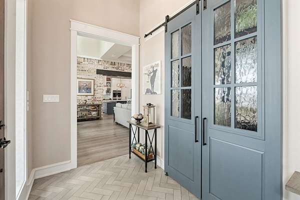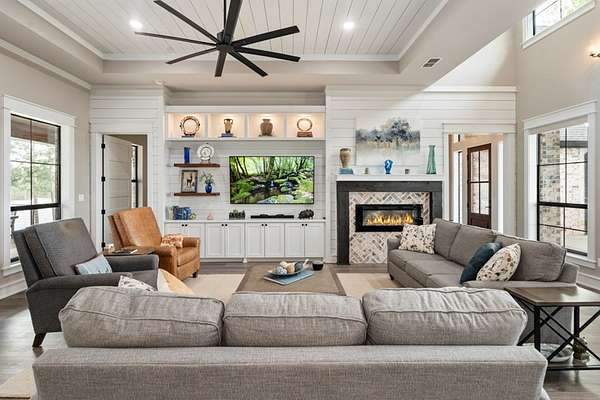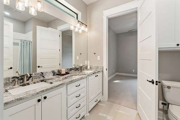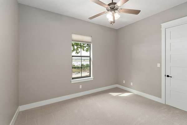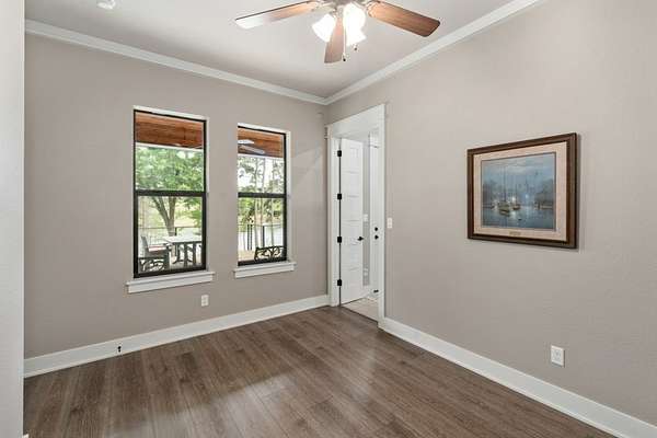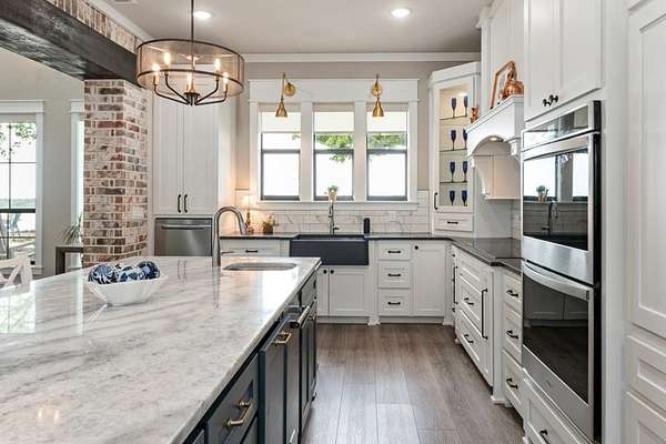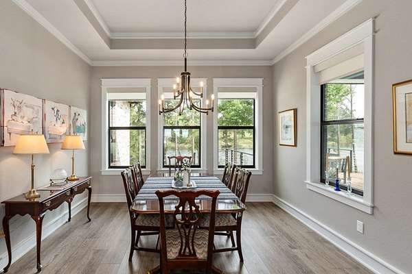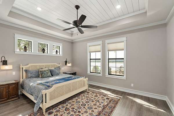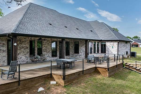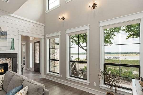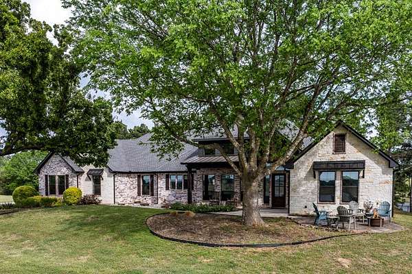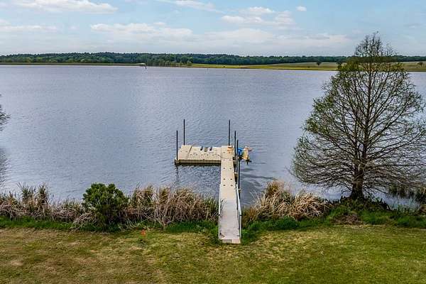 Custom built in 2020 and positioned on arguably one of the finest lots in Water's Edge Ranch, this exceptional 1.53 acre estates sits high on an expansive cul-de-sac, offering remarkable privacy and breathtaking lake vistas with water views on both sides of the home. Thoughtfully designed with an open-concept floor plan, the house showcases soaring ceilings, 8 ft doors, and expansive walls of windows that frame the spectacular setting and flood the interior with natural light. The chef's kitchen is both elegant and functional, featuring granite countertops, double ovens, an induction cook top, island prep sink, and a dedicated coffee bar- perfect for both everyday living and entertaining. The serene primary suite captures tranquil lake views and offers a spa inspired bath with double vanities, spacious walk-in shower, and an oversized closet with convenient pass-through to the laundry room. Three well-appointed guest bedrooms, include a Jack-and-Jill bath, plus an additional guest bath with walk-in shower. A private office and versatile flex room provide ideal spaces for working from home, hobbies, or additional living. The exterior amenities are equally impressive. A three-car garage, abundant parking, and a large shop provide exceptional space for boat storage, a workshop, or the ultimate man cave. Outdoor living is highlighted by a beautiful flagstone patio , an expansive covered porch, and a large wood deck with modern cable railing - all designed to maximize the incredible views and peaceful setting . Completing the property is a private boat dock with kayak port, making it effortless to enjoy swimming, paddling, and the best of lakefront living.