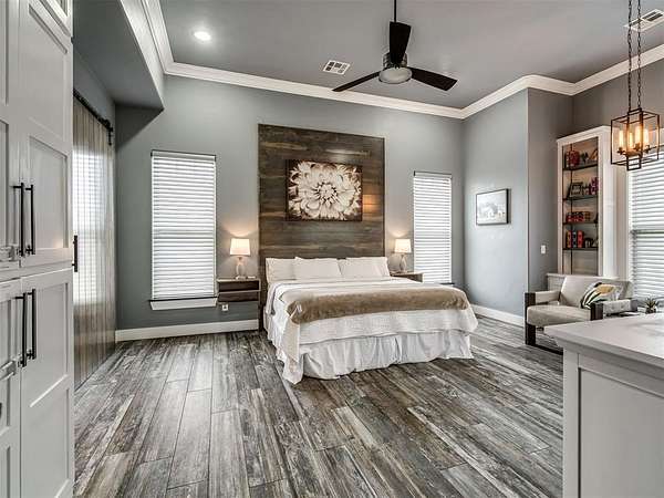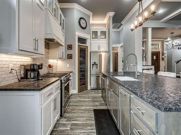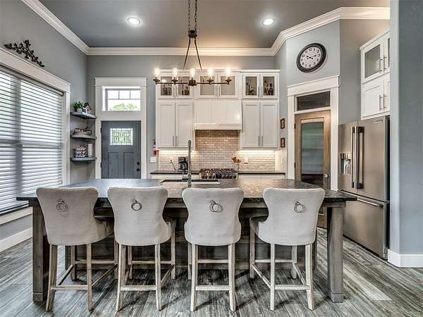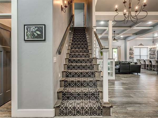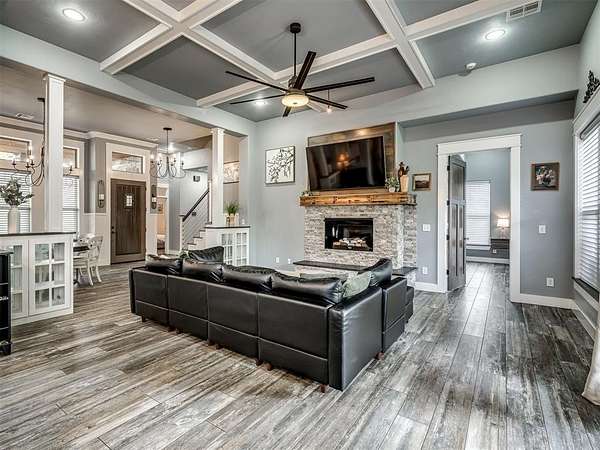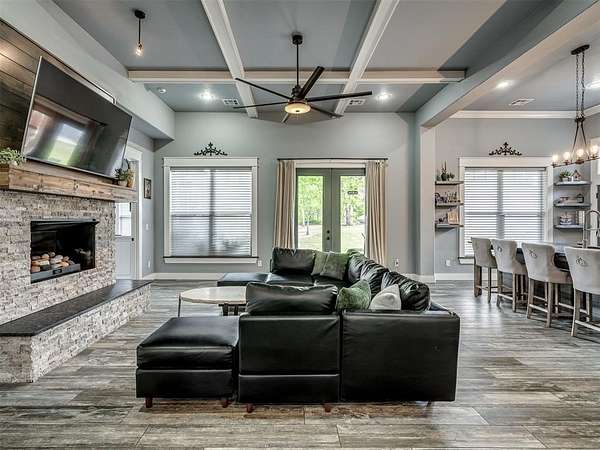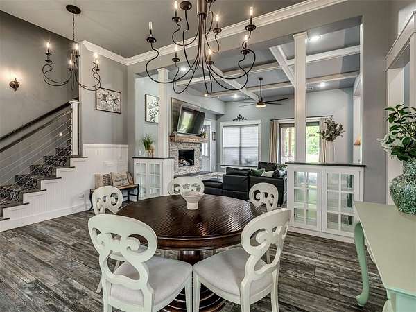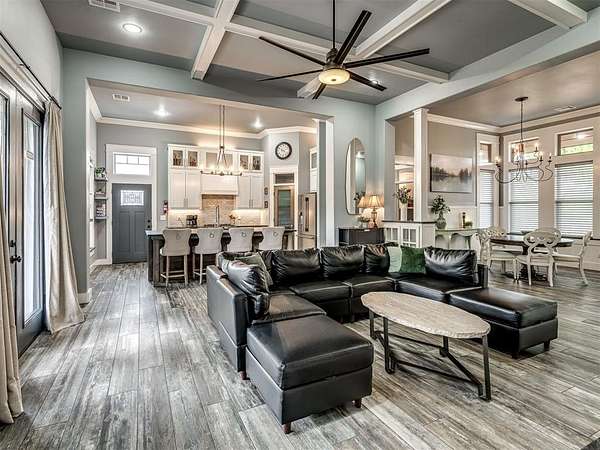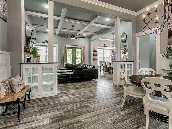 Nestled on approximately 4 private, wooded acres, this extraordinary custom-built estate offers a rare blend of luxury, privacy, & timeless design. Encompassing over 3,600sqft of refined interior living space plus 1,400+sqft of outdoor living areas, this one-of-a-kind residence was designed for elevated living & effortless entertaining. Soaring 12-ft coffered ceilings, spray foam insulation, wood-look tile flooring, designer finishes, & custom window treatments create an atmosphere of elegance throughout. The picture perfect kitchen features a large island, rich leather granite countertops, soft-close cabinetry, Frigidaire Professional appliances, & a walk-in pantry. The lavish primary suite is a private retreat with custom built-ins & a spa-inspired bath offering thermal heated floors, dual-head walk-in shower, & claw-foot soaking tub. 4 additional bedrooms & 3 beautifully appointed bathrooms provide exceptional comfort for family & guests. A private living space above the oversized 2-car garage offers endless flexibility for guests, executive office, studio, or multigenerational living. Outdoors, enjoy professionally curated landscaping, full sprinkler system, serene koi pond, whole-home generator, & an above-ground storm shelter that holds 15+. Completing the estate is an impressive 30x40x12 climate-controlled workshop with electric, water, fully insulated with plywood lined walls, & a private bath-ideal for collectors, entrepreneurs, or premium storage. Roof & gutters replaced in 2023. HVAC units replaced in 2024. A truly rare opportunity to own an exceptional estate where luxury, function, & natural beauty meet.