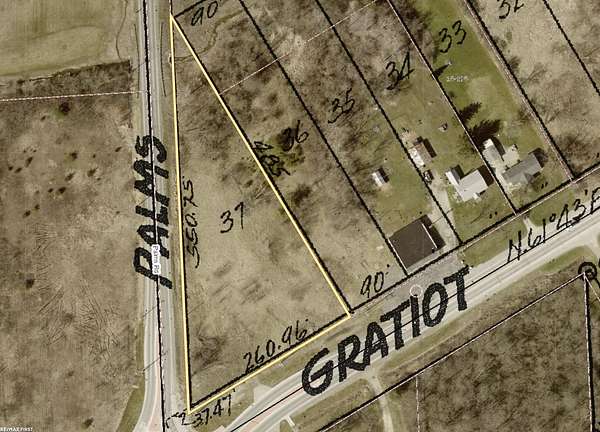 Est $513/moCommercial Zoning - Local Commercial 1.45 Acres Vacant Land Dual Main Rd Frontage with access to Gratiot and Palms Rd. 260.96 Feet Frontage on Gratiot, along with 550.75 on Palms Rd Cooper Drain Runs through small section of back property Well and Septic Needed. Natural Gas and Electric