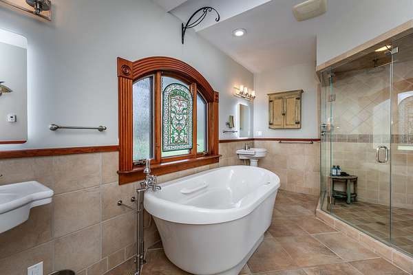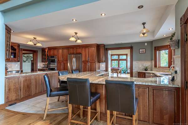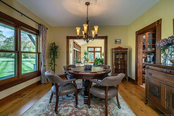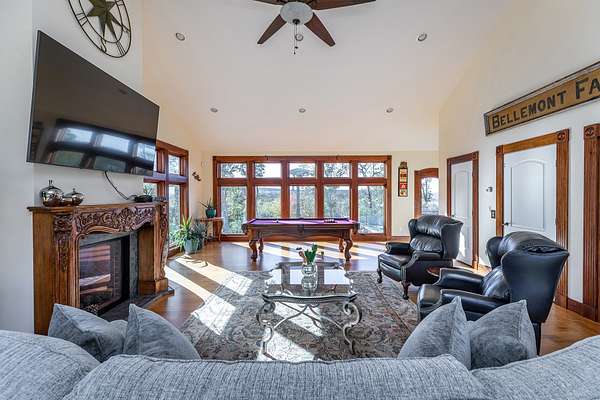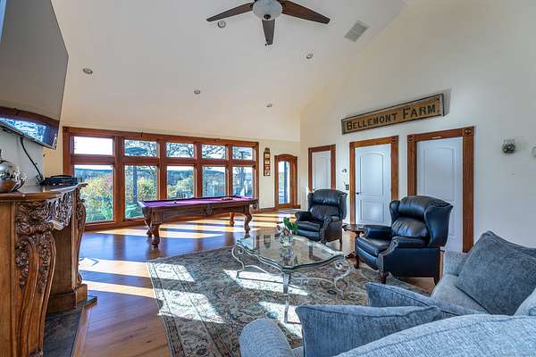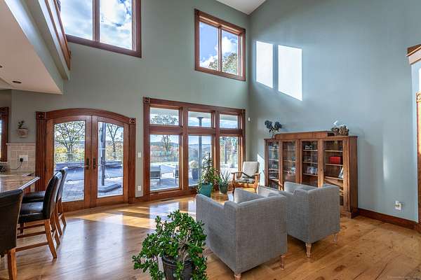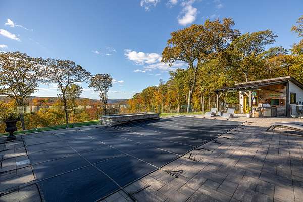 Perfectly positioned to capture breathtaking sunset views, this beautifully updated four-bedroom residence blends comfort, sophistication, and functionality. The home's chef-inspired kitchen features dual workstations and opens seamlessly to a cozy sitting area that extends outdoors to the pool and entertaining space. Here, you'll find a charming pool house, built-in grill, and bluestone patio-ideal for gatherings or quiet evenings under the stars. Inside, the great room impresses with walls of glass that flood the space with natural light and a fireplace that anchors the room with warmth and style. The main-floor primary suite offers a spa-like retreat with a soaking tub, separate shower, and dual walk-in closets. The main level also includes a formal dining room, a private office, and the convenience of a residential elevator providing easy access to all levels. Upstairs, there is an ensuite bedroom and two additional bedrooms that share a well-appointed bath. The finished lower level expands the living space with a full bath, laundry area, and flexible rooms perfect for a media room, gym, or recreation area. Set on a private 10+ acres featuring a picturesque pond and a detached barn ideal for a car enthusiast or hobbyist, this home offers the perfect balance of elegance, privacy, and modern living.
