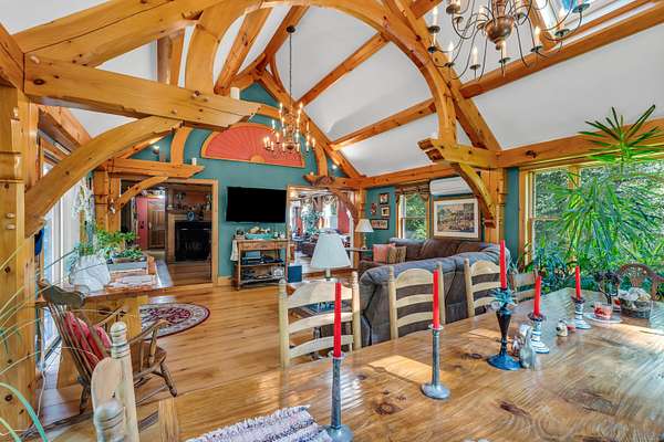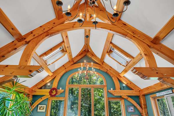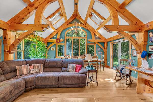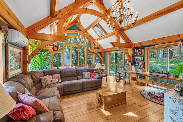 Enchanting Cape with Artisan Post & Beam Charm - Just Down the Road from Chester Village! Tucked away on 2 acres of picturesque land, this whimsical 3-bedroom, 2.5-bath Cape Cod home invites you to live among nature in style. Only a short distance from Cedar Lake and Chester Village, you'll have easy access to endless outdoor adventures and world-class restaurants and shopping just moments away. Inside, the home is a masterpiece of artisan post and beam craftsmanship, with a spacious great room featuring soaring ceilings, skylights that bathe the space in natural light, and exquisite woodwork that brings warmth and character to every corner. The thoughtful layout includes a generous primary suite with its own bath, two additional bedrooms, a full bath, and a convenient powder room for guests. Outside, the property is equally enchanting. The oversized detached garage and expansive workshop, both with the artisan craftsmanship of the main house, provide plenty of room for your hobbies and projects, while the barn and stables are ready for your animals. Whether you dream of an equestrian escape or simply crave a peaceful haven to enjoy nature, this home offers it all. From the captivating craftsmanship to the stunning natural surroundings, this is more than just a home, it's a retreat, a sanctuary, and a lifestyle.