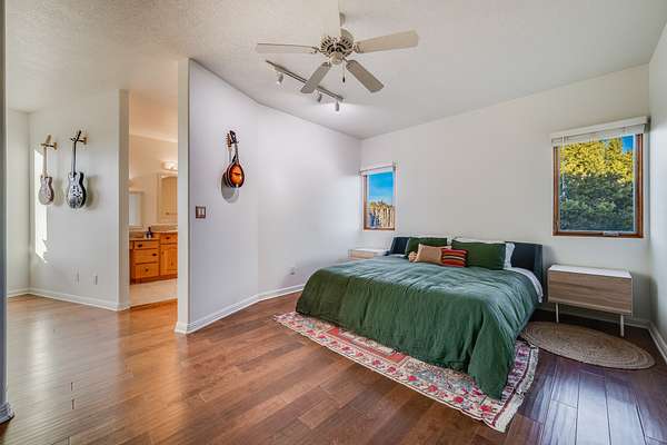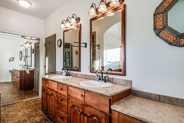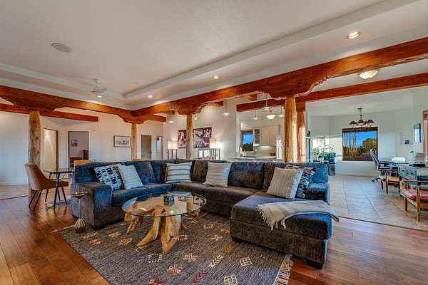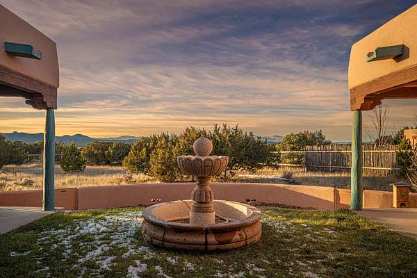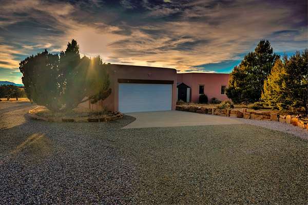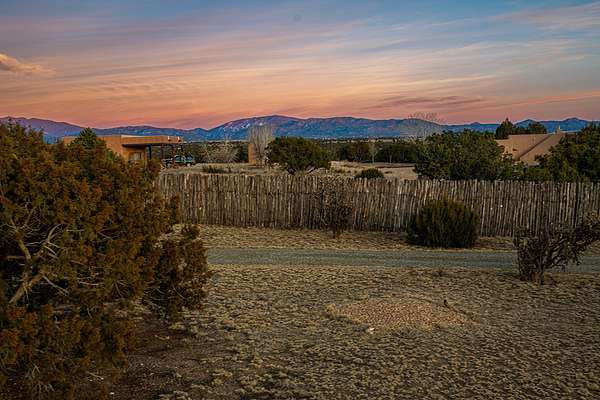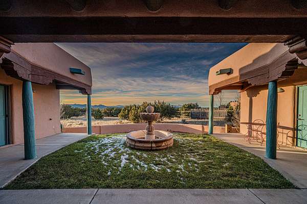 This spacious light view filled home offers a great value! Through the gated entry and into an extraordinarily captivating entrance this home feels like it is miles from everyone and yet it's within the neighborhood. Just a few minutes drive to Las Campanas and another few minutes to 599. This location is ideal for Living in style in the Northwest aea of Santa Fe. Each bedroom has views, natural light, access to the outside portals and ensuite baths. The natural minimalist landscaping is easy to maintain attractive from outside areaa, there is hard wiring lighting to the trees and irrigation. in addition why not have a party, there's plenty of within the grounds parking as well as a detached carport replete with Vegas and a propanel roof perfect for your recreational vehicles. There is also an attached two-car garage that is finished inside.Two fireplaces, Excellent storage and all the amenities one would expect can be yours. This is move-in ready.