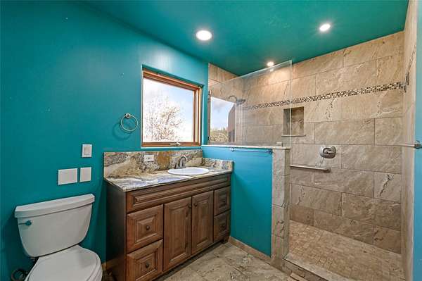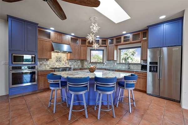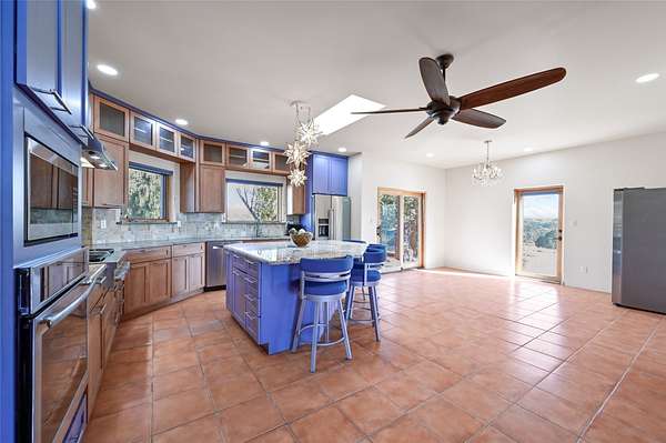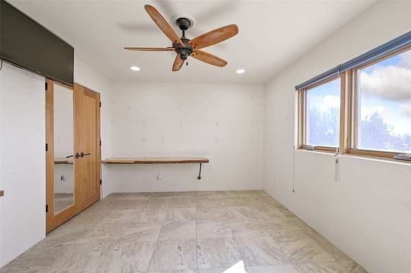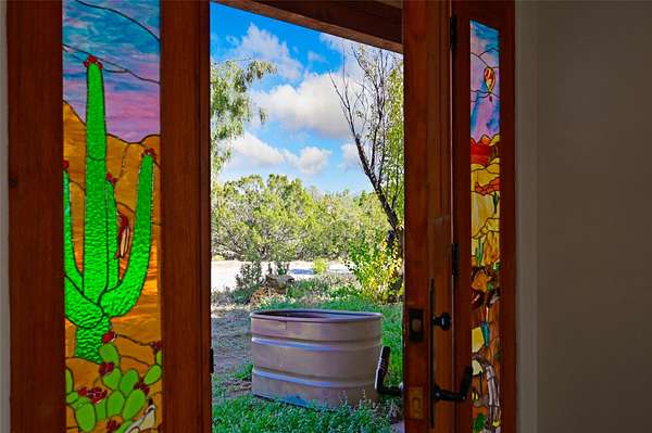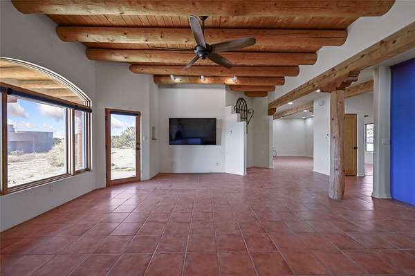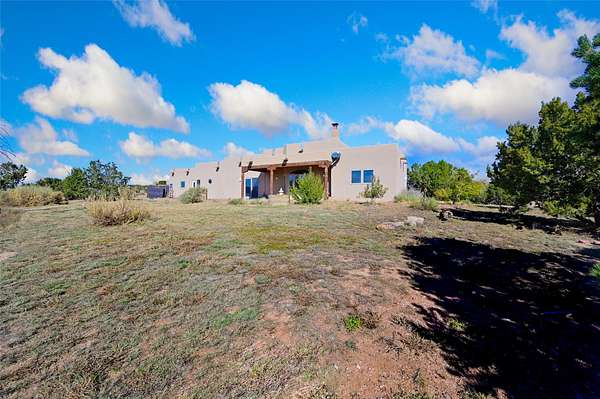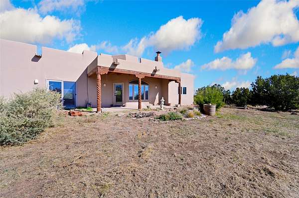Desirable Eldorado location with stunning Sangre de Cristo and Sandia Mountain views! Set on almost two acres, this beautiful home offers the perfect balance of rural serenity and easy access to Santa Fe's shops, dining, and amenities. Featuring viga ceilings, a very large open floor plan, and generously sized rooms throughout, the home combines spaciousness with classic Santa Fe charm. The flexible layout includes three ensuite bedrooms, four bathrooms, plus an office, ideal for guests, family, or a home workspace. Numerous recent upgrades include the kitchen, bathrooms, well equipment, and roof, providing modern comfort and peace of mind. The modern eat-in kitchen opens to bright living areas accented by wood vigas and a kiva fireplace. Enjoy in-floor radiant heat and take in the expansive mountain views from the covered portal, perfect for outdoor dining or quiet evenings. A two-car garage and workshop/artist studio offer ample space for projects and storage. With breathtaking views, thoughtful upgrades, and an unbeatable Eldorado setting, this home truly has it all-space, style, and comfort in every detail.