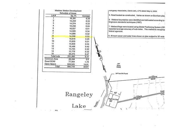 A terrific lot at the end of a dead end road, very close to the deeded Rangeley Lake private beach. A great opportunity to own a lot and build your own custom home in the newest neighborhood in Rangeley. Town water and sewer. Bright, sunny lot tucked away on the end of the street. Snowmobile right from your doorstep. Walk a short distance to Rangeley Lake, deeded and exclusive to this neighborhood. Sandy beach, facing west, overlooking the island. A super opportunity and great investment. There are a total of 15 lots in this lovely subdivision. Lots of potential!! A short walk through a wooded path to downtown Rangeley. Approximately 15 acres of common grounds. Common dock. Close to marina. Underground power at site. Enjoy common dock facing west for spectacular sunsets. Common HOA area for trailer storage.