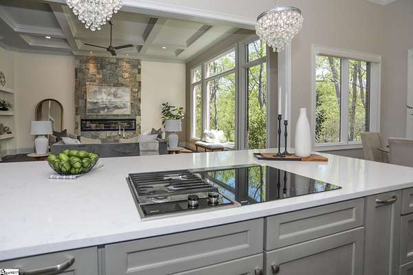 Experience unparalleled luxury just 10 minutes from downtown Greenville!! Nestled in Greenville's premier gated community, Montebello, this European - inspired mountain estate is set against the western slopes of the Piney mountain in a 1.8 acre lot, one of the largest in the subdivision. This gorgeous home is designed and built by Milestone Custom Builders, Greenville's premier custom home builder with over 25 years' experience, for those who value elegance, comfort and functionality. This exquisite homesite compliments Montebello's natural beauty, with a classic and eclectic home feature exteriors of brick, stone and real stucco. Enter through the front porch with flagstone floor and begin exploring the main level's incredible craftsmanship and its masterfully arranged layout. An open concept plan with 12 ft. ceiling throughout the main level, resorts style living room with coffered ceiling and floor to ceiling windows flood the home with natural light. The expansive great room features an electric fireplace surrounded by gorgeous stone on three sides that soars all the way to the ceiling and wide plank flooring. Just off the foyer and conveniently located near the kitchen and great room, the large circular formal dining room features a coffered ceiling and a gorgeous light fixture.The gourmet chef kitchen boasts top of the line wolf range, bespoke cabinetry, and oversized quartz island, perfect for entertaining. The covered porch is perfectly located to enjoy over the private back yard and features wooden ceiling and safety net with railing and a double door to the backyard. On the opposite side of the house from the kitchen are the downstairs master bedroom unit and a study with natural light and mountain views. Rounding out the main level is the laundry room with Iron-a-way built-in wall table, the powder room, and the attached 3 car garage with epoxy flooring. On the second level the upstairs master suite with spa-like bath is gorgeous with frameless shower glass, beautiful large teardrop vanity mirror, large overhead shower and beautiful vintage tile walls. There is a large library and lounge area with built-in shelves, two bedrooms with attached bathrooms ensuring plenty of privacy and breathtaking views of the blue ridge mountains from each room. There is also a walk-in attic area on the second level for any storage needs. The basement level offers many options and is finished to the same standard as the second level with 10 ft. ceilings. There is a gym room with full-size wall mirrors and a game room with specialized rubber flooring. There is also a full size media room with built in projector and a large home theater screen. This level also has a bedroom with excellent views and a full bath. The gym room has backyard access through double doors to the natural trail behind the landscaped area of the property. There is also plenty of unfinished area for storage or a private wine cellar. The basement area would make a great mother-in-law suite, a private home office, an older child's living quarters, home gym, artist studio...the possibilities are endless. The house has spray foam insulation to decrease energy consumption, modern gutter downspouts and separate air conditioning units for each level. The professional crafted boulder stone landscaping with the lush gardens create an unbelievable serene outdoor retreat with a scenic drive and a separate parking pad in front of the house. This modern masterpiece showcases clean lines, soaring ceilings and a seamless blend of indoor and outdoor living designed to impress even the most sophisticated tastes. Homeowners share a variety of natural amenities including Club Bella, six parks, ponds, Lake Como, Olympic swimming and toddler pools with a bath house, lighted tennis and pickle-ball courts, putting green, playground and sixty areas of green ways and twelve miles of private streets and walkways. This is an unbelievable opportunity to own this one of a kind estate!