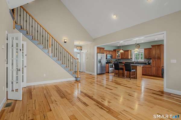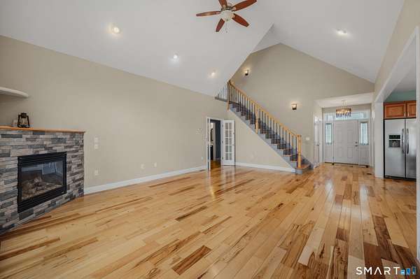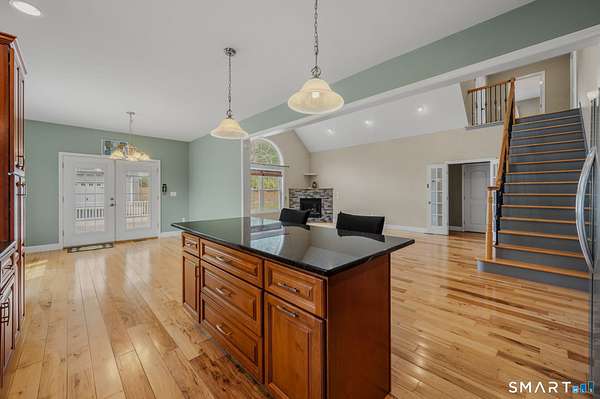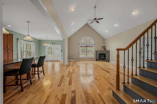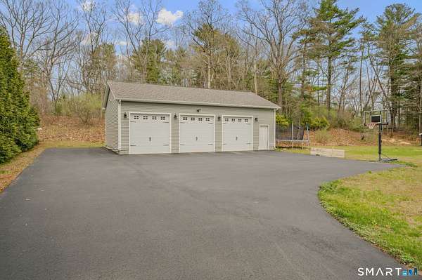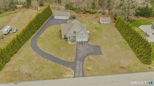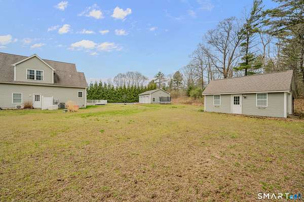 Experience the best of country living-deeded access to Pachaug Pond in private 8-home cul-de-sac community-perfect for boating enthusiasts & those seeking a peaceful setting. Enjoy a short walk to the assoc. beach & dock, offering easy access to one of the area's most desirable recreational ponds.This Contemporary Cape features an open floor plan with 5 bedrooms, 2.5 baths with highly sought-after first-floor primary suite ideal for one-level living. A second main-level bedroom, currently used as an office, and a convenient first-floor laundry room add to the home's functionality. The eat-in kitchen with center island flows to a spacious deck partially covered, partially open overlooking a level backyard, perfect for outdoor enjoyment. The living room offers a cathedral ceiling and gas fireplace creating a warm & inviting space.Upstairs, you'll find 3 generously sized bedrooms, full bath & walk-in attic storage. Car enthusiasts, hobbyist or those needing serious workspace will appreciate the oversized detached 3-car garage ideal for working on vehicles, storing boats or accommodating multiple projects while attached 2-car gar. provides direct access to the home for everyday convenience. Addit'l heated space off the attached garage w/water & electricity offers endless possibilities for home business, workshop, gym or studio. Rare opportunity combining country charm, one level living option, exceptional garage & access to Pachaug Pond for boating, fishing & outdoor enjoyment.