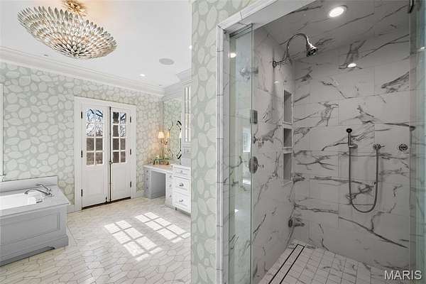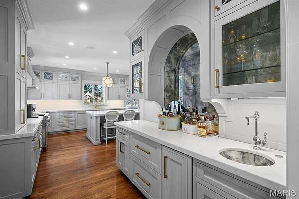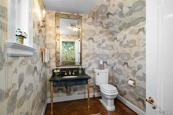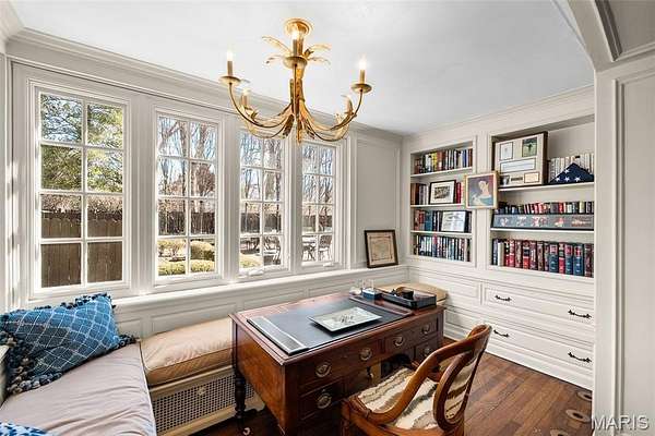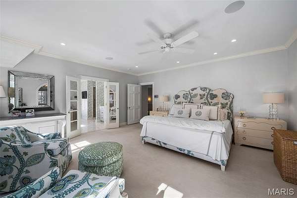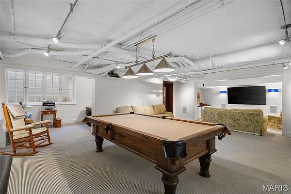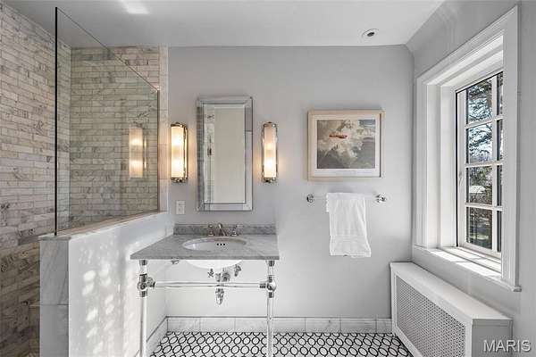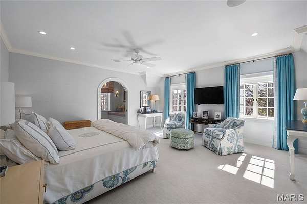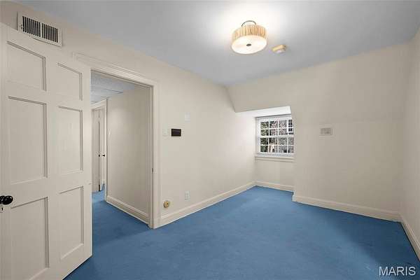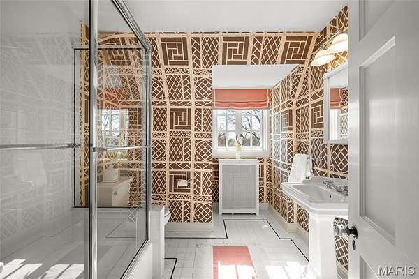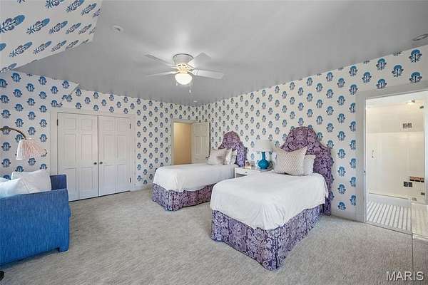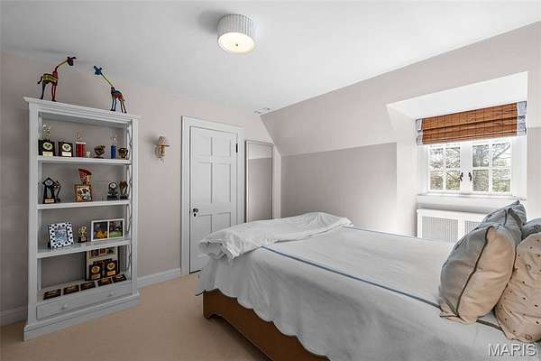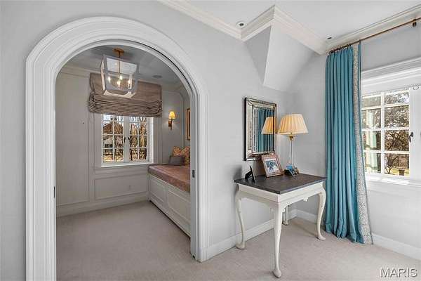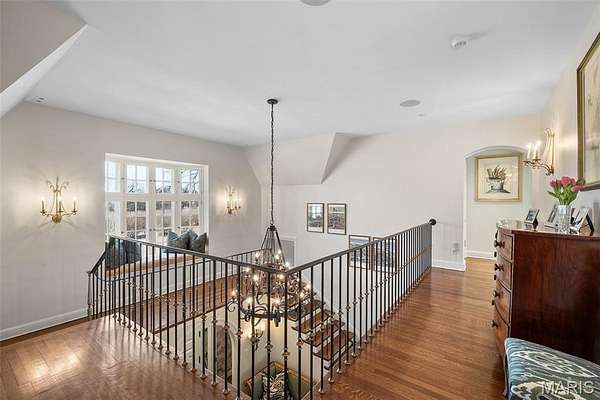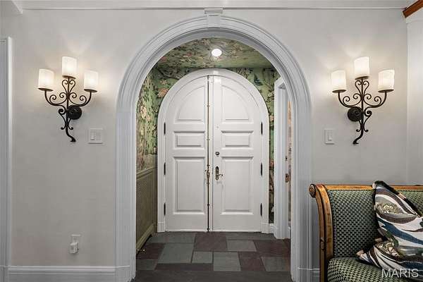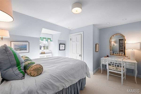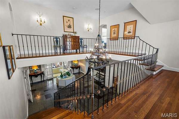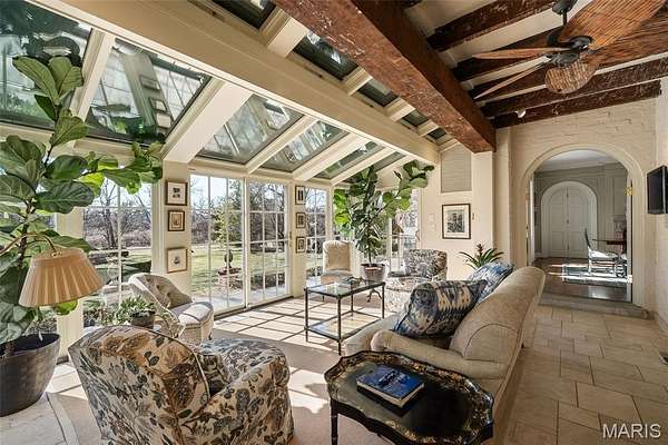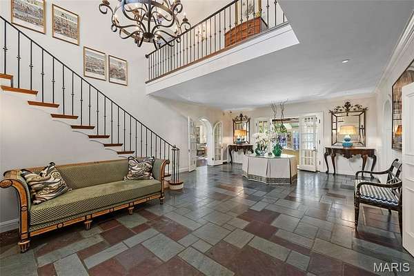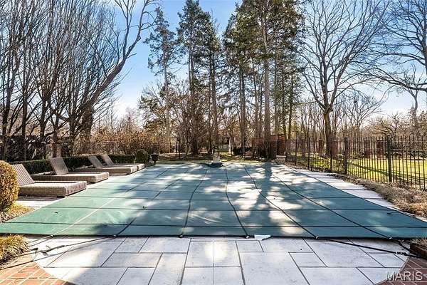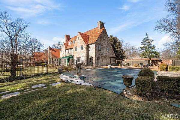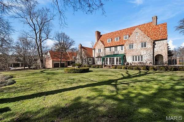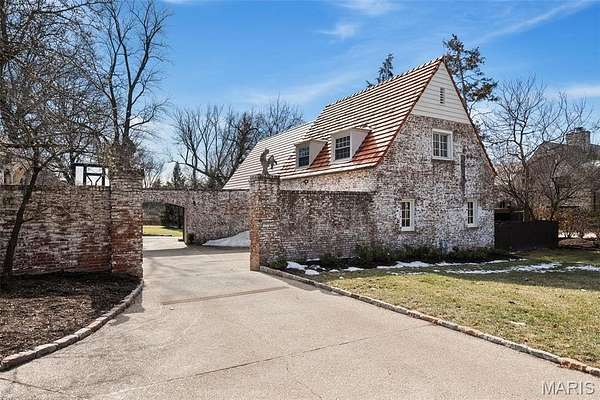 Set along one of Ladue's most exclusive and private lanes, this truly unique estate is a rare architectural offering, evoking the charm of the English countryside. A discreet circular drive creates a gracious arrival, highlighting the inviting facade of whitewashed brick, classic tile roof, and timeless detailing--an elegant expression of the enduring design of one of St. Louis's preeminent early 20th century architects, and an introduction that immediately sets this home apart. Inside, a dramatic two-story entry with slate floors sets the tone for interiors that balance grand scale with warmth and livability. The expansive paneled living room is perfectly suited for both everyday enjoyment and memorable holiday gatherings. A light-filled sunroom opens seamlessly to the extraordinary grounds beyond, where an expansive, flat lot is framed by mature trees and complete privacy, anchored by a bluestone patio, serene saltwater pool, and dedicated pool bath--an ideal setting for outdoor entertaining or quiet retreat. The dining room stuns with fresh lacquered walls and a striking marble mantel, flowing effortlessly into the chef's kitchen with marble countertops, custom cabinetry, and an inviting eat-in space. A well appointed bar connects to the vaulted family room, where a cozy fireplace creates the perfect gathering place. The main house offers six bedrooms, including a luxurious primary suite with a spa-like bath featuring heated floors, steam shower, double vanities, and an expansive walk-in closet. Two oversized ensuite bedrooms occupy the second floor, while the third floor includes three additional bedrooms sharing a beautiful hall bath. The lower level is designed for both leisure and wellness, complete with a temperature-controlled wine room, recreation space, exercise area, sauna, and steam room. A heated four-car garage is topped by a spacious apartment offering flexible living space, bedroom, full bath, and kitchenette--ideal for guests, extended family, or private work-from-home needs. Geothermal heating and cooling add efficiency to this remarkable estate. Properties of this caliber are seldom available, and this residence has not been offered to the public market in many years, having changed hands quietly--making this opportunity all the more special. Rich in character, rare in availability, and endlessly inviting, this is a truly special residence that feels both storied and timeless.