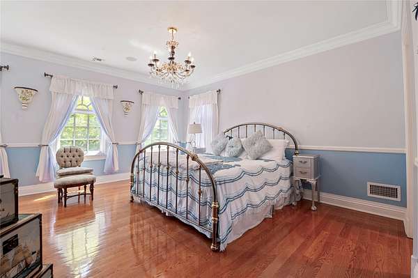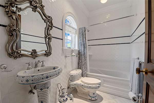 Enter through grand 10-foot double doors into a dramatic two-story foyer, where radiant heated marble floors with an inlaid mosaic design meet a sweeping bridal staircase and gold-accented custom moldings. The gourmet chef's kitchen is a showstopper, featuring top-of-the-line Viking appliances, a walk-through pantry, and a full second summer kitchen for seamless entertaining.
