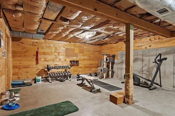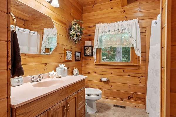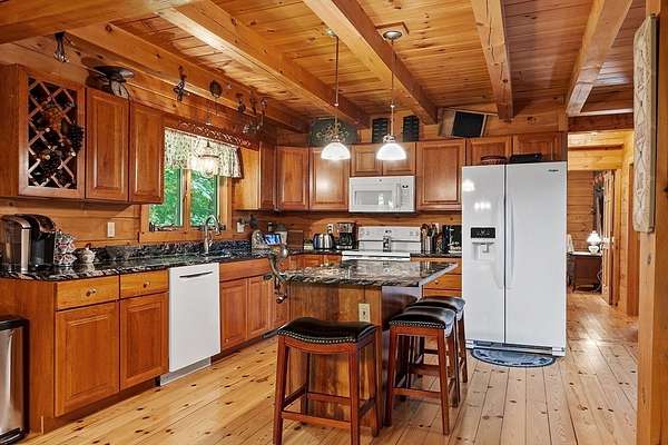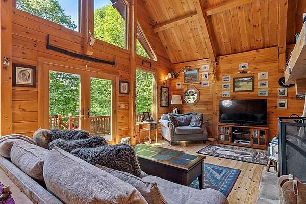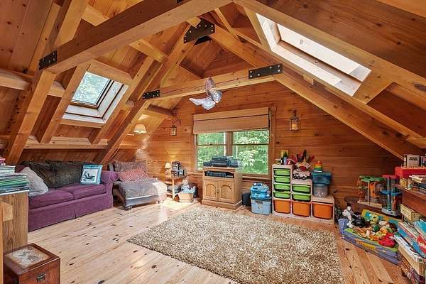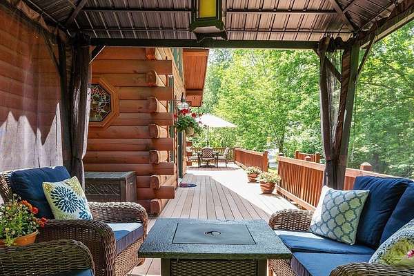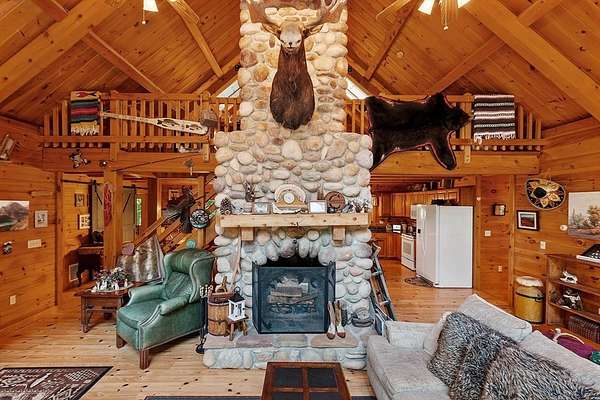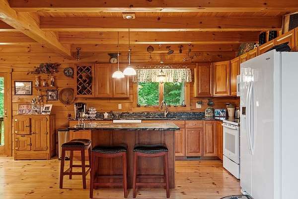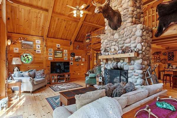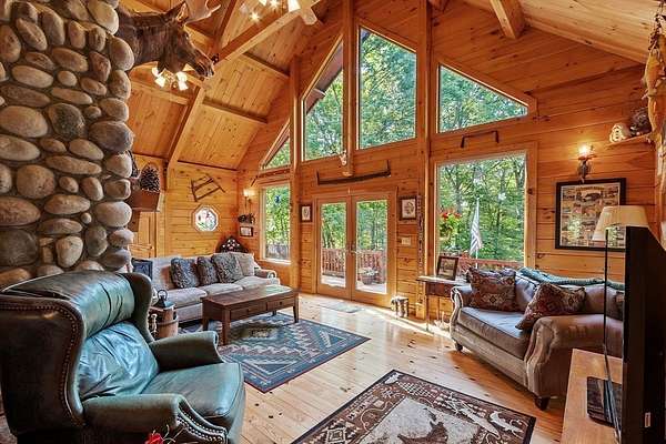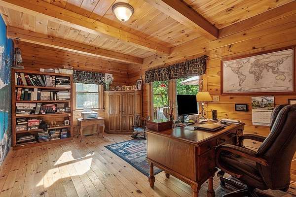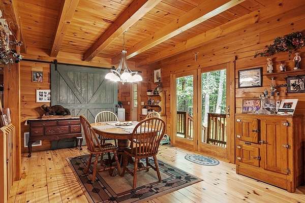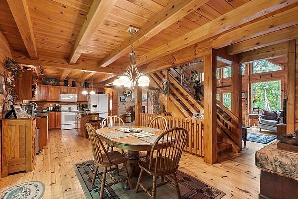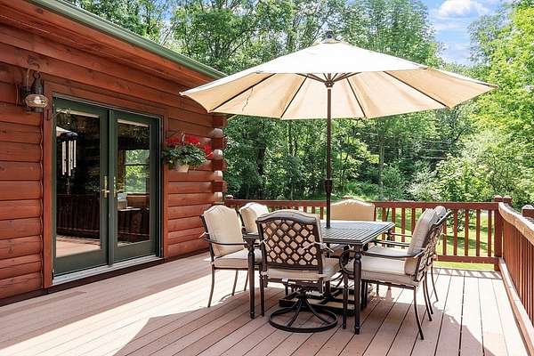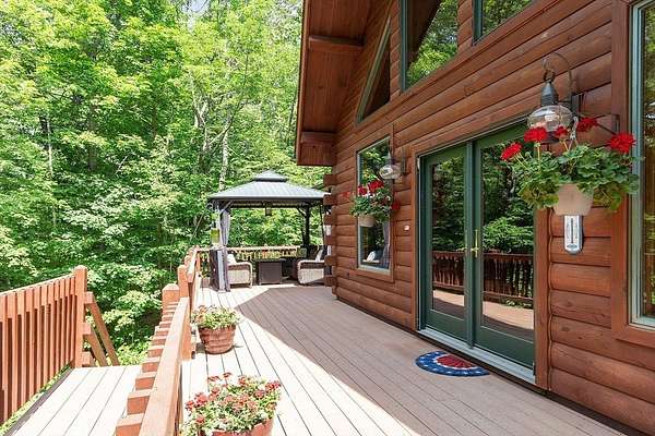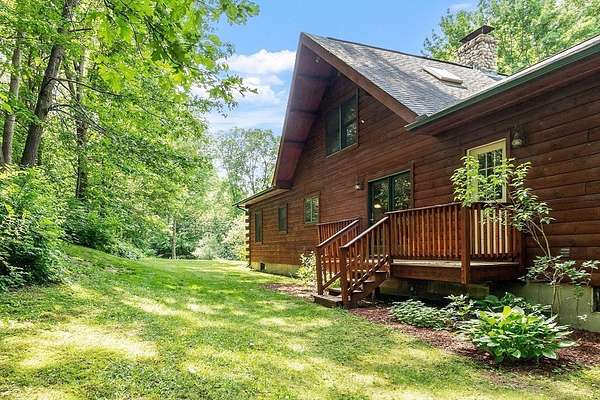 OPEN HOUSE SUN 11/9 from 1PM-2PM Contemporary Log home, 1st time available for sale from its original owners. 1.52 acre private wooded setting. The facade was constructed so seasonal water views of Sacrarrappa Pond would be on full display. A 932 sqft composite deck with dual staircases spans the length of the house w/ an attached screened-in gazebo. Large picture windows provide the main living space with natural light. The 2-story River Rock fireplace is centerpiece of the open concept living space with high end 4"/5" pine flooring and natural woodwork throughout. The office has a wall mural for extra flair. A property like this can feel like a year-round getaway, but the central air will keep you comfortable. The basement was framed out with two large sections just in case future owners want to finish the basement and add window space. Granite countertops, main bath w/ open slate shower, loft area, custom barn door, basement wood stove, octagon stained glass windows, & more.