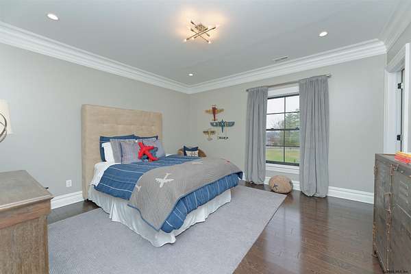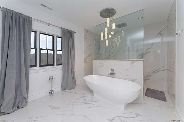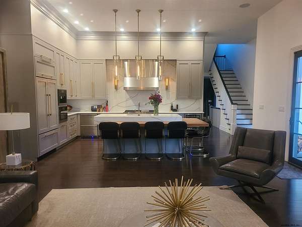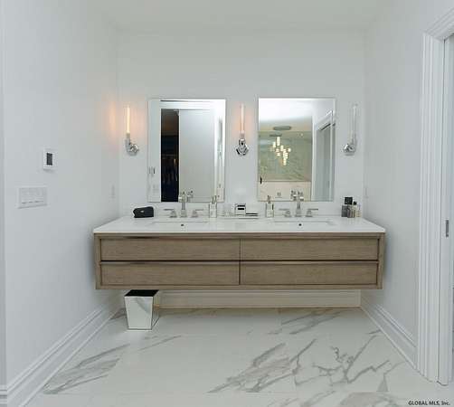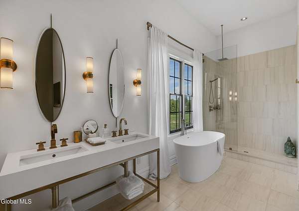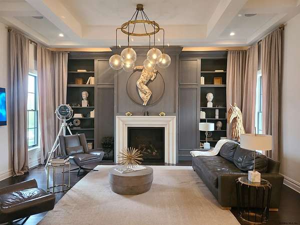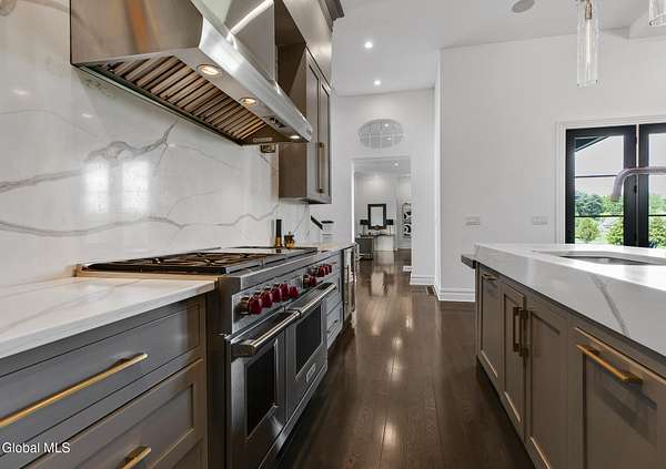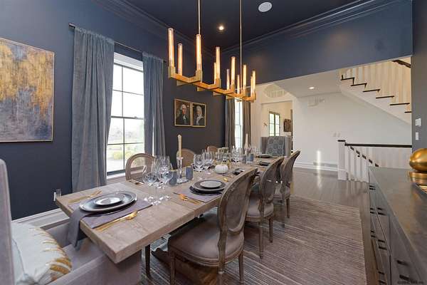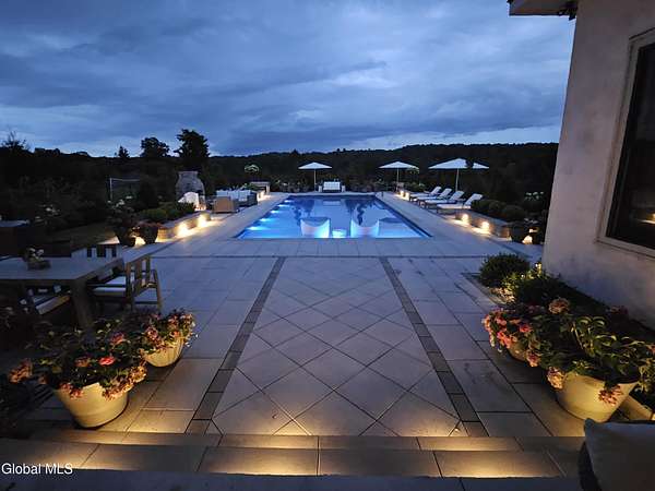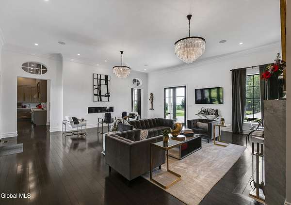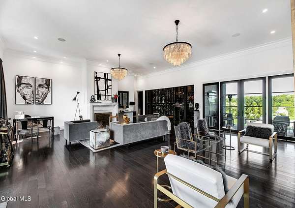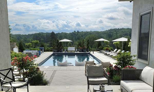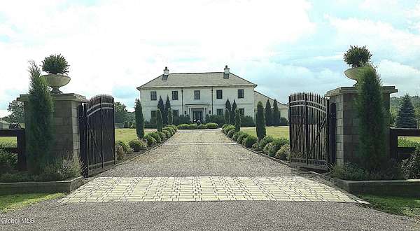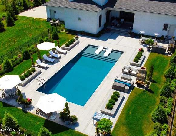 Stunning Georgian-style estate on 8+ acres located just 10 minutes from the Saratoga racetrack. Designed for entertaining, this 5-bedroom home offers an open floorplan with a comfortable, elegant, contemporary finish unique to other luxury homes in the Capital District. Your family and guests can relax and take in the incredible views by the heated, saltwater pool as you fire up the grill at the Stoll custom outdoor kitchen with bar, sink, and fridge. End the day down at the pond, surrounded by nature and gather at the firepit. Features: 12' ceilings, dual fireplaces, a climate-controlled wine cellar, and both first and second-floor primary suites, pool bathroom, and finished lower level. Premium appliances: Bosch, Miele, Wolf, and Sub-Zero.