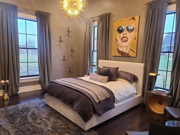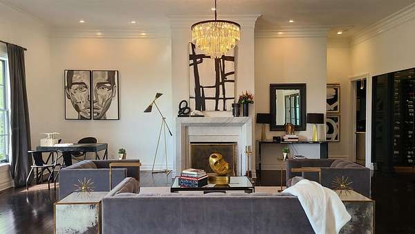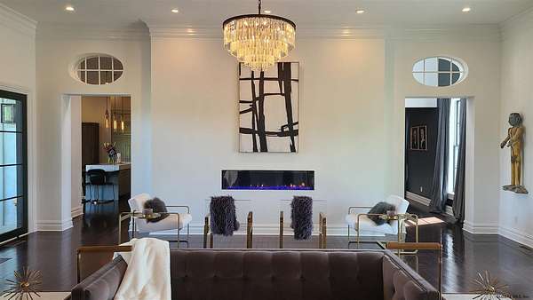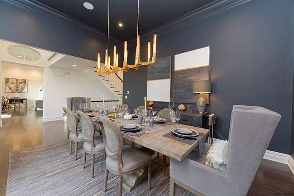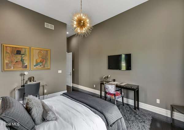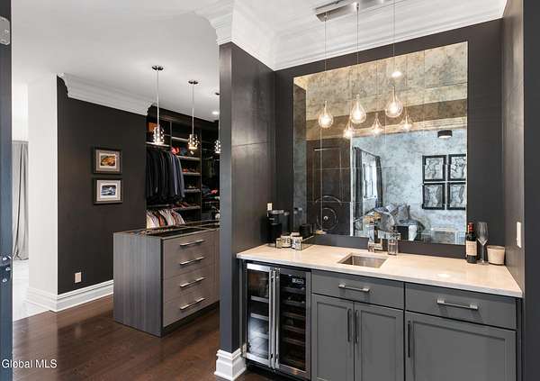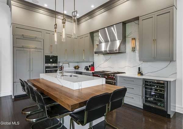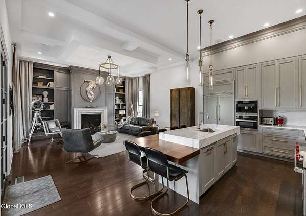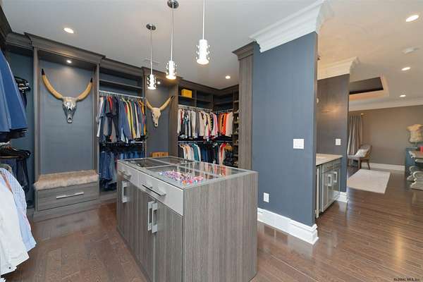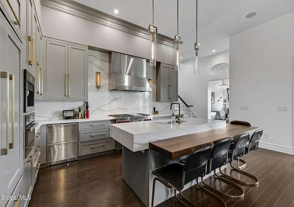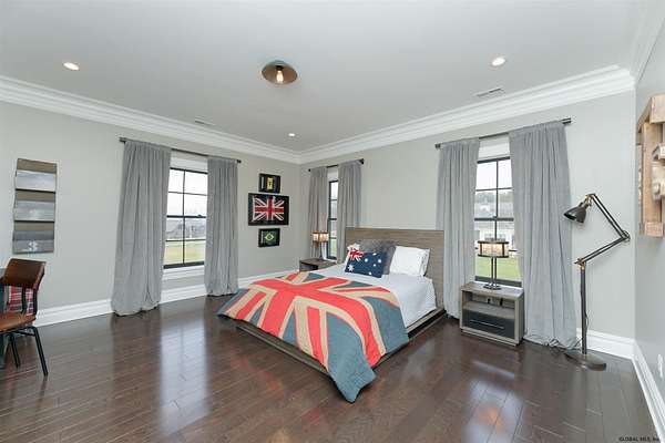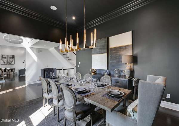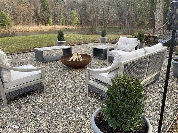 Stunning Georgian-style estate on 8+ acres located just 10 minutes from the Saratoga racetrack. Designed for entertaining, this 5-bedroom home offers an open floorplan with a comfortable, elegant, contemporary finish unique to other luxury homes in the Capital District. Your family and guests can relax and take in the incredible views by the heated, saltwater pool as you fire up the grill at the Stoll custom outdoor kitchen with bar, sink, and fridge. End the day down at the pond, surrounded by nature and gather at the firepit. Features: 12' ceilings, dual fireplaces, a climate-controlled wine cellar, and both first and second-floor primary suites, pool bathroom, and finished lower level. Premium appliances: Bosch, Miele, Wolf, and Sub-Zero.