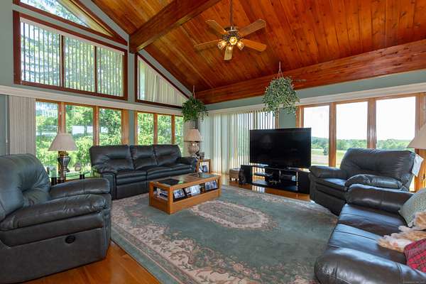 Welcome to this 80 acre Connecticut Estate, tucked into the rolling hills of Woodstock Ct. This exceptional 4,655 sq ft contemporary home offers a unique living experience with its own privately owned public FAA approved commercial grade airport. The property is a pilot's paradise, featuring a spacious hangar that not only accommodates multiple small planes and helicopters but also offers ample room for vehicle storage. The hangar is self-sufficient with its own septic, well, electrical, and heating systems, providing convenience and flexibility as well as a finished lounge area to gather and relax. This property is a rare find, offering a blend of luxury, functionality, and the ultimate in private aviation convenience! Whether you're an avid pilot, car enthusiast, or simply seeking a tranquil retreat, this home promises an unparalleled lifestyle. This residence boasts privacy and scenic New England beauty with stunning views. The contemporary design, built in 1987, features 3 bedrooms and 4 bathrooms, open living space with soaring ceilings, two story fireplace, and a beautiful open center oak staircase. The home's large windows and open layout invite the natural surroundings inside, creating a harmonious living environment. The finished walkout lower level offers beautiful views of the pond and the plush grounds. So many exciting possibilities!