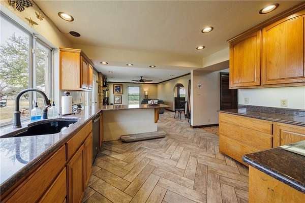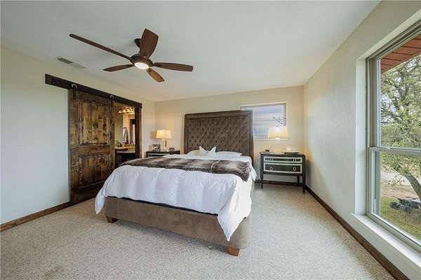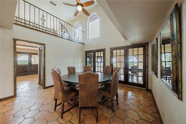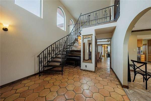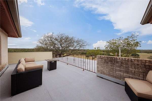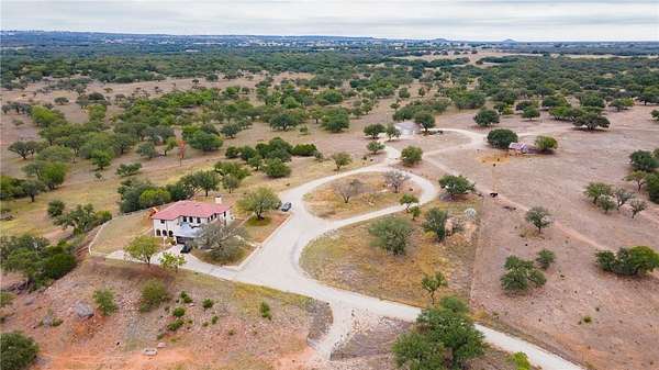 Stunning Spanish Mediterranean Style home sitting on over 40 acres! You'll immediately notice the grandness of this property as your drive up to the home that sits on top of a hill with panoramic views of the Texas Hill Country. This majestic hilltop house includes 4 Bedrooms, 2.5 Bathrooms, multiple balconies and porches, and a very RARE basement - could easily be used as a playroom or office. Enjoy entertaining in the open concept living, dining and kitchen. Big windows allow ample natural light making the home feel spacious, while the fireplace creates a cozy atmosphere. Numerous updates have been done to the property including all new triple pane windows, new septic tank, large 48x40 work or equipment shop on a concrete slab with electricity and covered parking, a 50-amp RV hookup, new electrical line in-conduit to the well, Tesla charger, gutters that have been trenched out, and new caliche driveway. There's also an additional cased well on the property for an additional build site. Endless opportunities to make this your permanent home, a hunting ranch, or gorgeous wedding venue. The privacy and beauty are unmatched. Must see in person! Farm Equipment and Livestock are negotiable. Located less than 5 miles from downtown Goldthwaite and 90 miles to Austin.