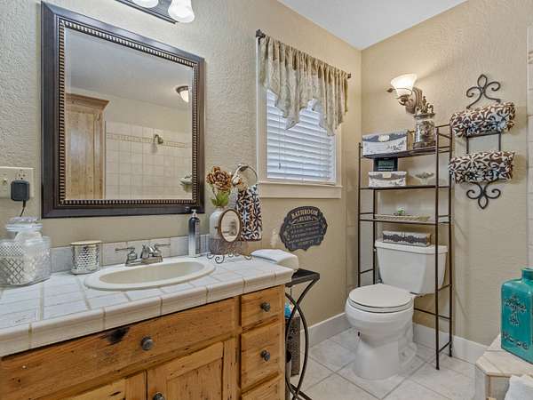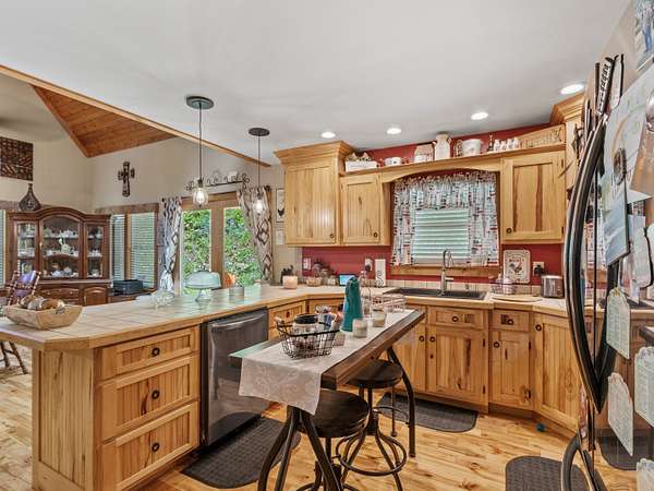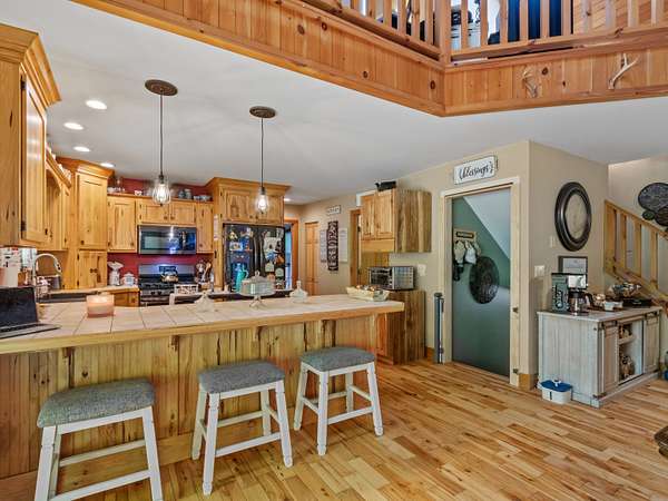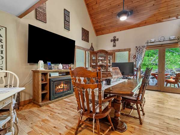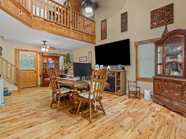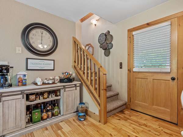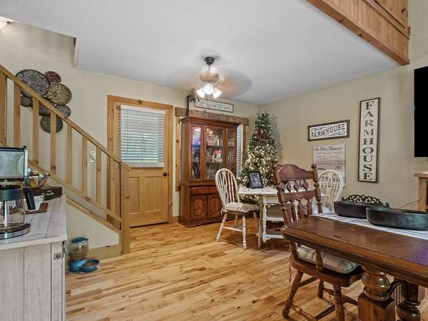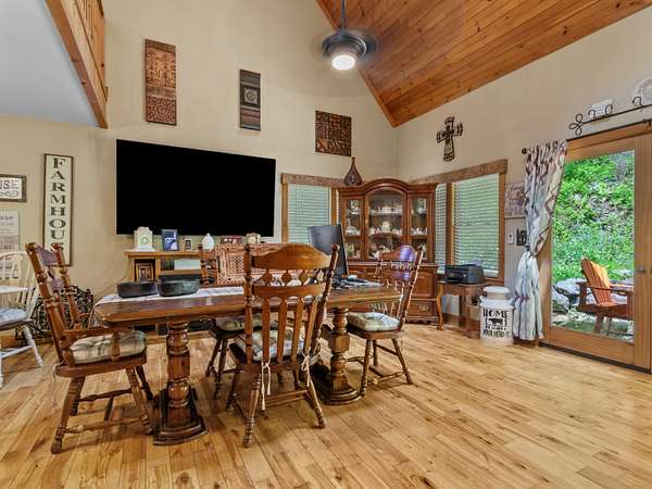 Mountain. With attractive stone landscaping, board and batten siding, hardwood floors, and hickory cabinets, this home is a true mountain cabin retreat. An