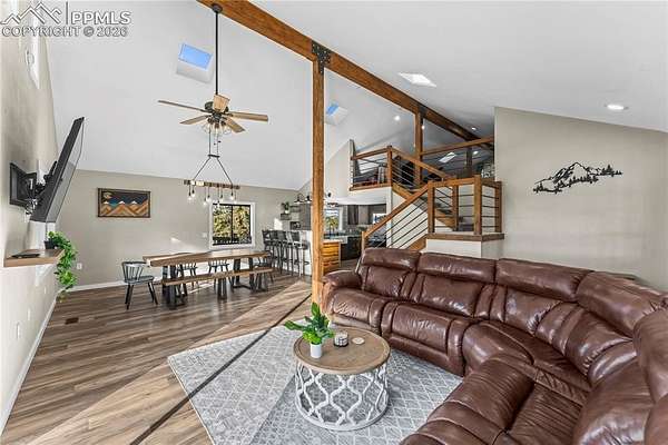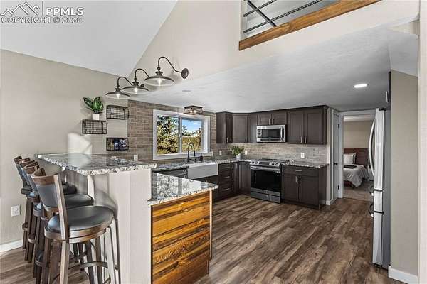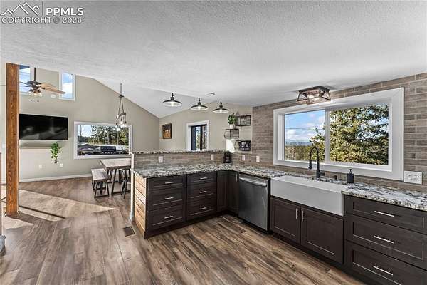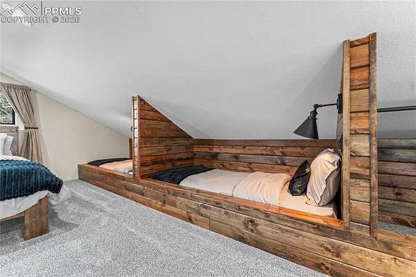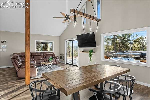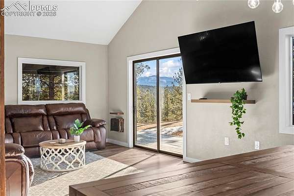 If you're looking for a home with breathtaking mountain views, multiple main-level bedrooms and bathrooms, and great potential for living or investment, this is the property for you! Nestled atop an 8-acre corner lot and backing to two 80-acre ranches providing tremendous privacy, this beautifully updated 1974 mountain retreat offers sweeping views of Pikes Peak, Crystal Peak, and the surrounding mountain ranges as far as the eye can see. Ample natural light pours throughout the home, highlighting vaulted ceilings and the open-concept living and dining area, creating a bright and inviting main-level space. The updated kitchen features chiseled-edge granite countertops, a matte porcelain brick backsplash, farmhouse sink, stainless steel appliances, and bar-top seating. A full wraparound deck extends the living space outdoors, providing the perfect spot to take in the views and mountain vibes. Upstairs, four built-in beds offer flexible options for guests, a play area, or a cozy short-term rental bunk space. The basement features a large open area plus an additional bedroom/bonus space, fully plumbed and wired for a second kitchen, with a half bath and shower rough-in-ideal for an in-law suite or full living area with its own private entrance. A single-car attached garage adds versatile functional space for storage, a workshop, or hobbies. Outside, the property includes two storage sheds and endless opportunities to enjoy the outdoors. This mountain retreat offers peaceful, private mountain living with flexible space to suit a variety of lifestyles, creating a welcoming place to gather and relax while soaking in the mountain serenity!