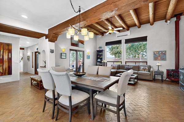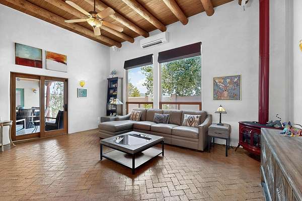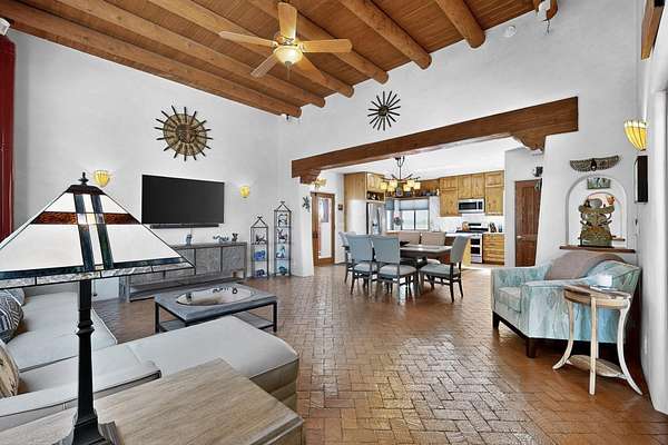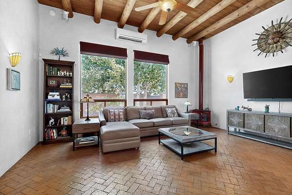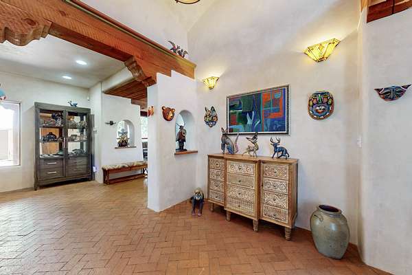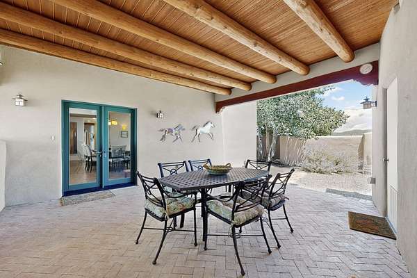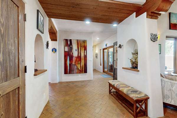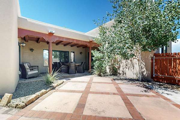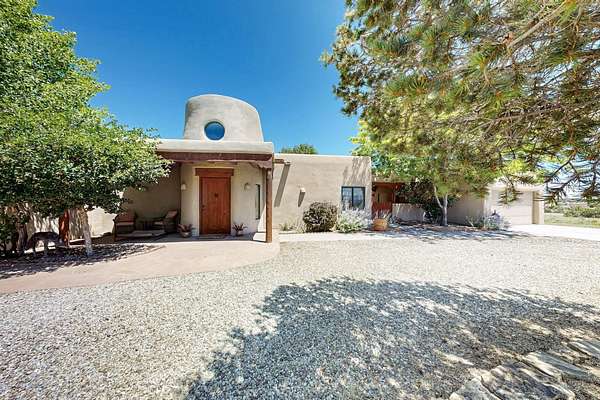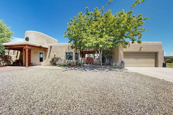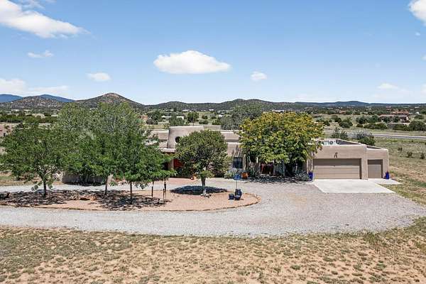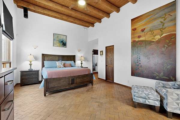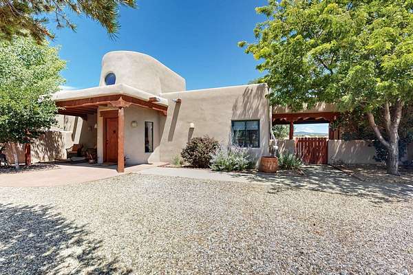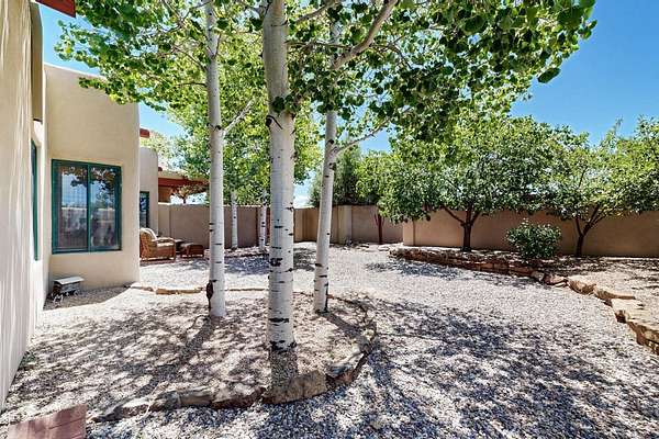 - Set on an expansive 2.73-acre lot in the highly coveted La Paz neighborhood, this exceptional Santa Fe residence offers refined living with timeless Southwestern style. Surrounded by mature aspens and beautifully landscaped grounds, the property welcomes you with a circular driveway and a sense of tranquil privacy. Inside, rich plaster walls, gorgeous brick flooring, and hand-hewn vigas reflect the region's architectural heritage, while soaring high ceilings and tall windows fill the home with light and airiness. The open-concept living, dining, and kitchen space is perfect for entertaining, featuring a custom chef's kitchen with high-end finishes and creative storage solutions. Multiple outdoor living spaces invite you to enjoy Santa Fe's famous skies-ideal for relaxing, dining, or gathering with friends and family. A flexible studio/gym/bonus room with heating and cooling offers even more room to create, work, or unwind. Additional highlights include a new water softener with reverse osmosis, a spacious two-car garage with epoxy floors, and a covered breezeway connecting to the main home. The home comes with a 1-year transferrable warranty. This is truly a rare offering-where luxury meets comfort in one of Santa Fe's most desirable communities.