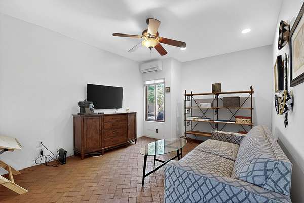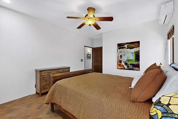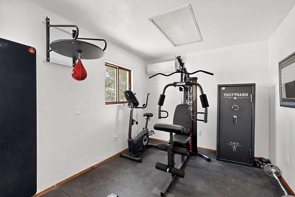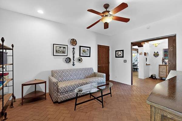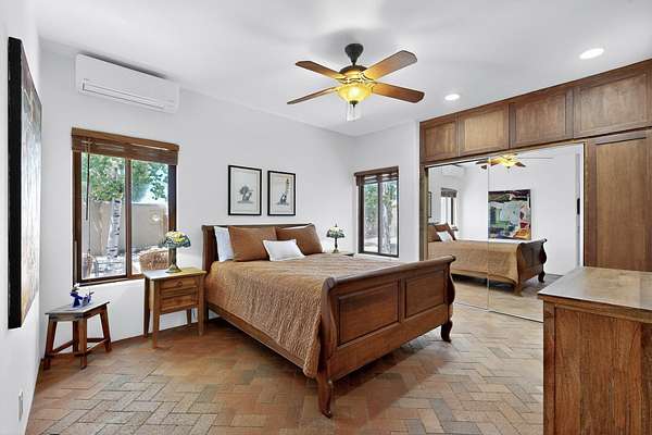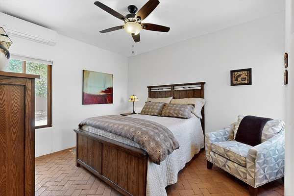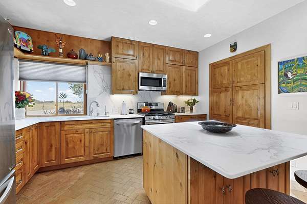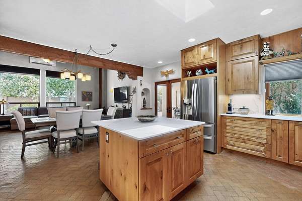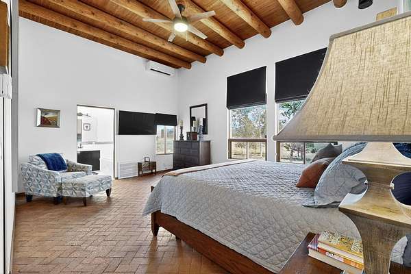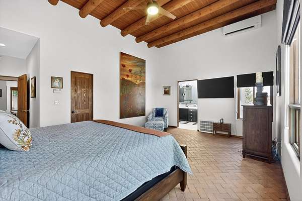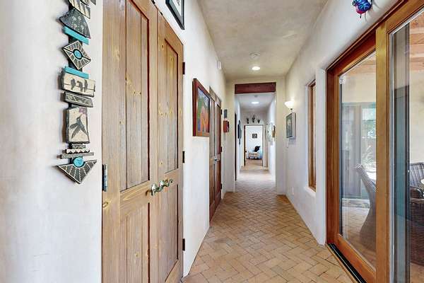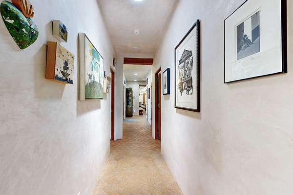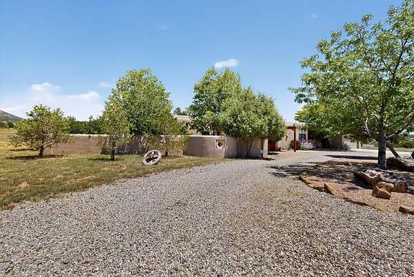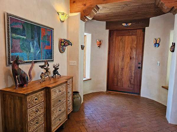 - Set on an expansive 2.73-acre lot in the highly coveted La Paz neighborhood, this exceptional Santa Fe residence offers refined living with timeless Southwestern style. Surrounded by mature aspens and beautifully landscaped grounds, the property welcomes you with a circular driveway and a sense of tranquil privacy. Inside, rich plaster walls, gorgeous brick flooring, and hand-hewn vigas reflect the region's architectural heritage, while soaring high ceilings and tall windows fill the home with light and airiness. The open-concept living, dining, and kitchen space is perfect for entertaining, featuring a custom chef's kitchen with high-end finishes and creative storage solutions. Multiple outdoor living spaces invite you to enjoy Santa Fe's famous skies-ideal for relaxing, dining, or gathering with friends and family. A flexible studio/gym/bonus room with heating and cooling offers even more room to create, work, or unwind. Additional highlights include a new water softener with reverse osmosis, a spacious two-car garage with epoxy floors, and a covered breezeway connecting to the main home. The home comes with a 1-year transferrable warranty. This is truly a rare offering-where luxury meets comfort in one of Santa Fe's most desirable communities.